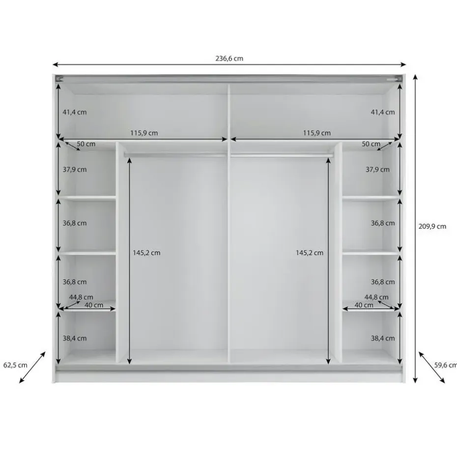 Kledingkast Samantha beschikt over 2 schuifdeuren met spiegel. De binnenkant bestaat uit 2 kledingroedes en 10 opbergvakken. Het meubel wordt ongemonteerd geleverd. Je dient het dus met behulp van de bijgeleverde handleiding zelf in elkaar te zetten.