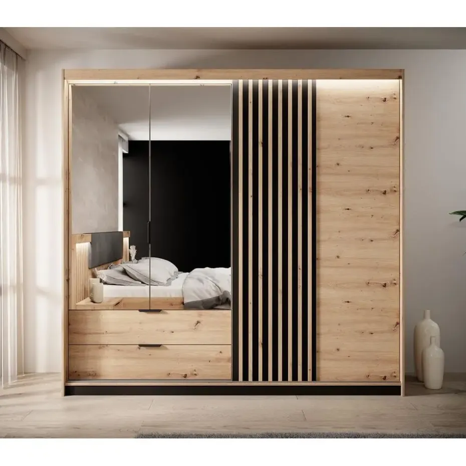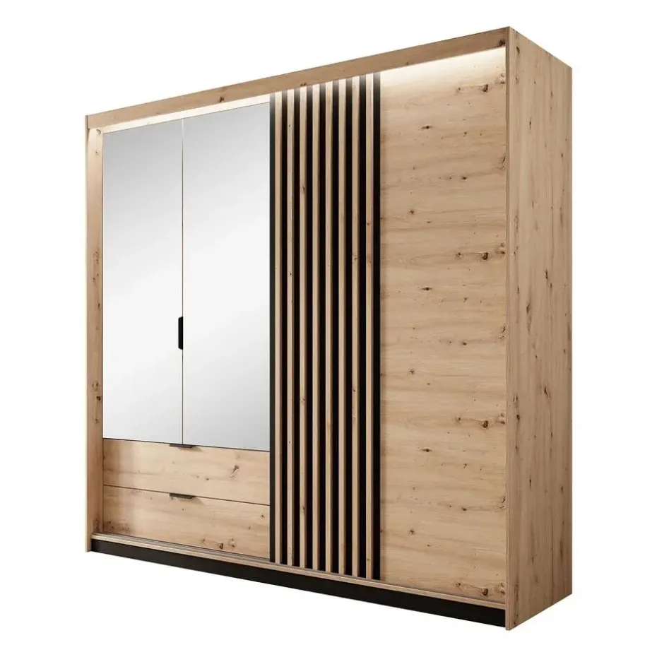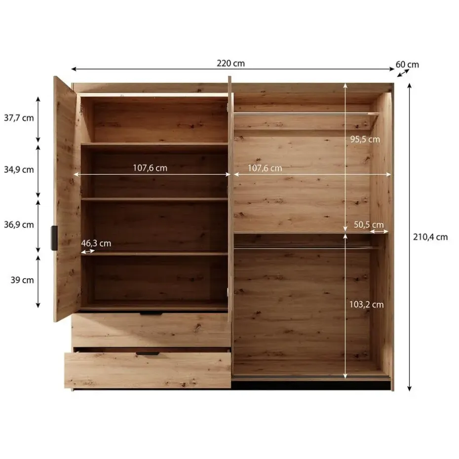 Kledingkast Tasha is gemaakt in een eiken kleur. Beschikt over 2 scharnierdeuren en een schuifdeur die openen met zwarte handgrepen. In de binnenkant bevinden zich 4 opbergvakken, twee lades en twee kledingroedes. Het meubel wordt ongemonteerd geleverd. Je dient het dus met behulp van de bijgeleverde handleiding zelf in elkaar te zetten.
