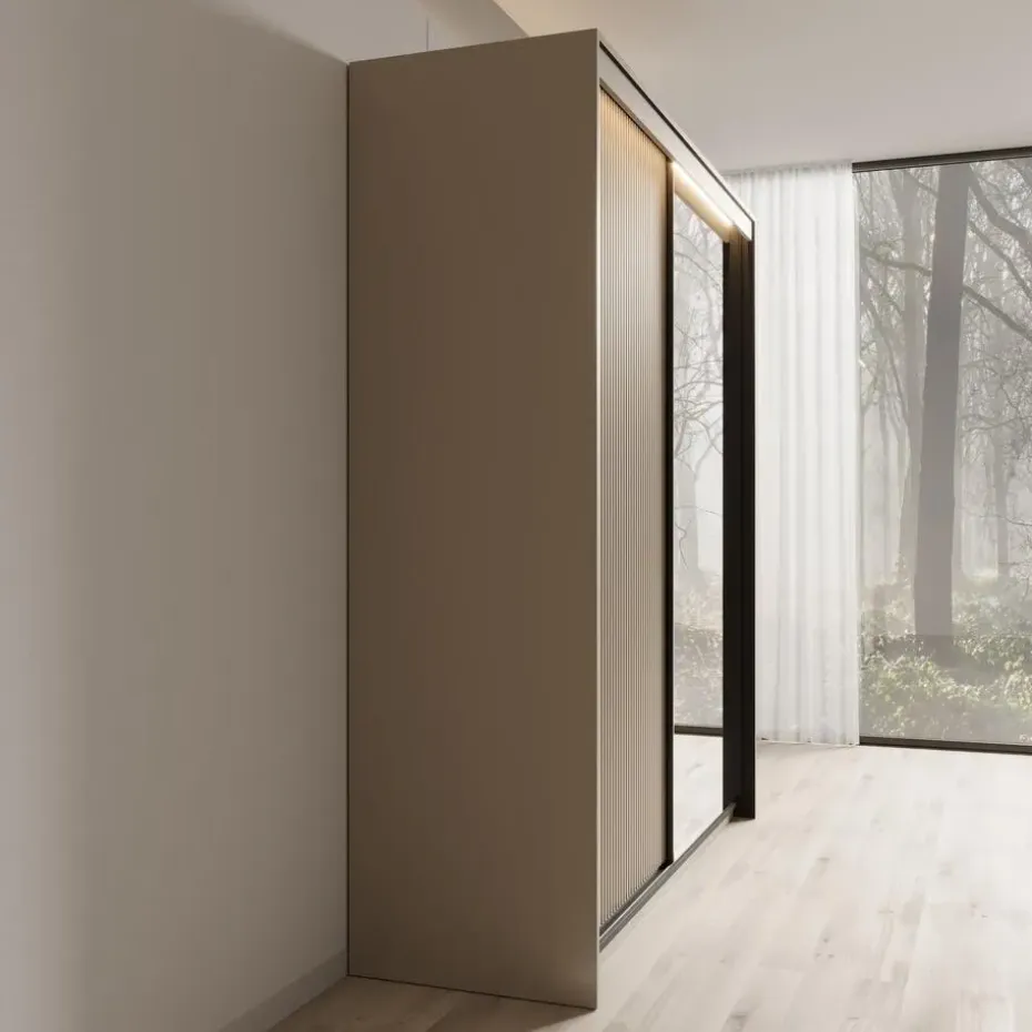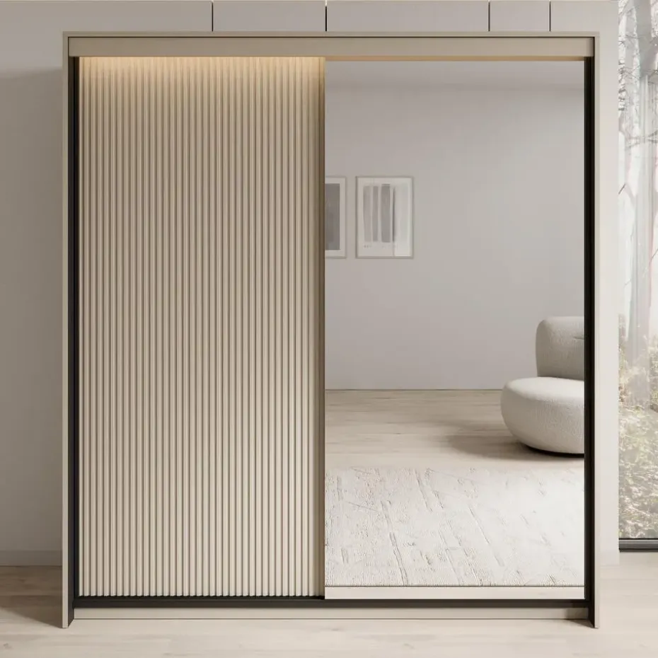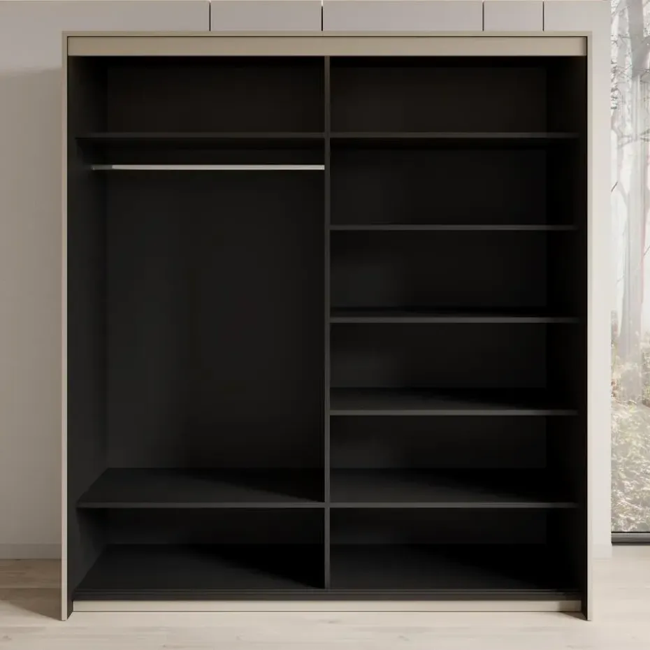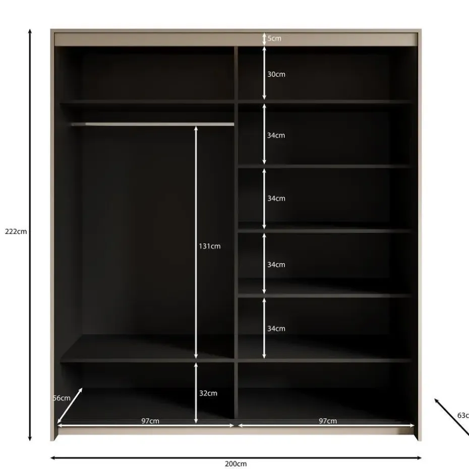 De Timoteo is uitgevoerd in beige en beschikt over 2 schuifdeuren. De rechterdeur is voorzien van een spiegel, de linker van een latten patroon. De binnenkant bestaat uit 8 opbergvakken en 1 kledingroede. Wordt geleverd inclusief LED-verlichting. Het meubel wordt ongemonteerd geleverd. Je dient het dus met behulp van de bijgeleverde handleiding zelf in elkaar te zetten.