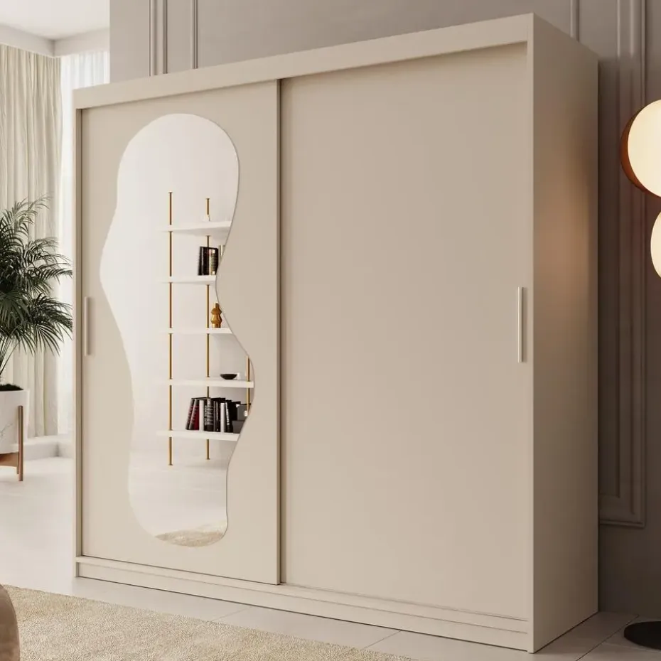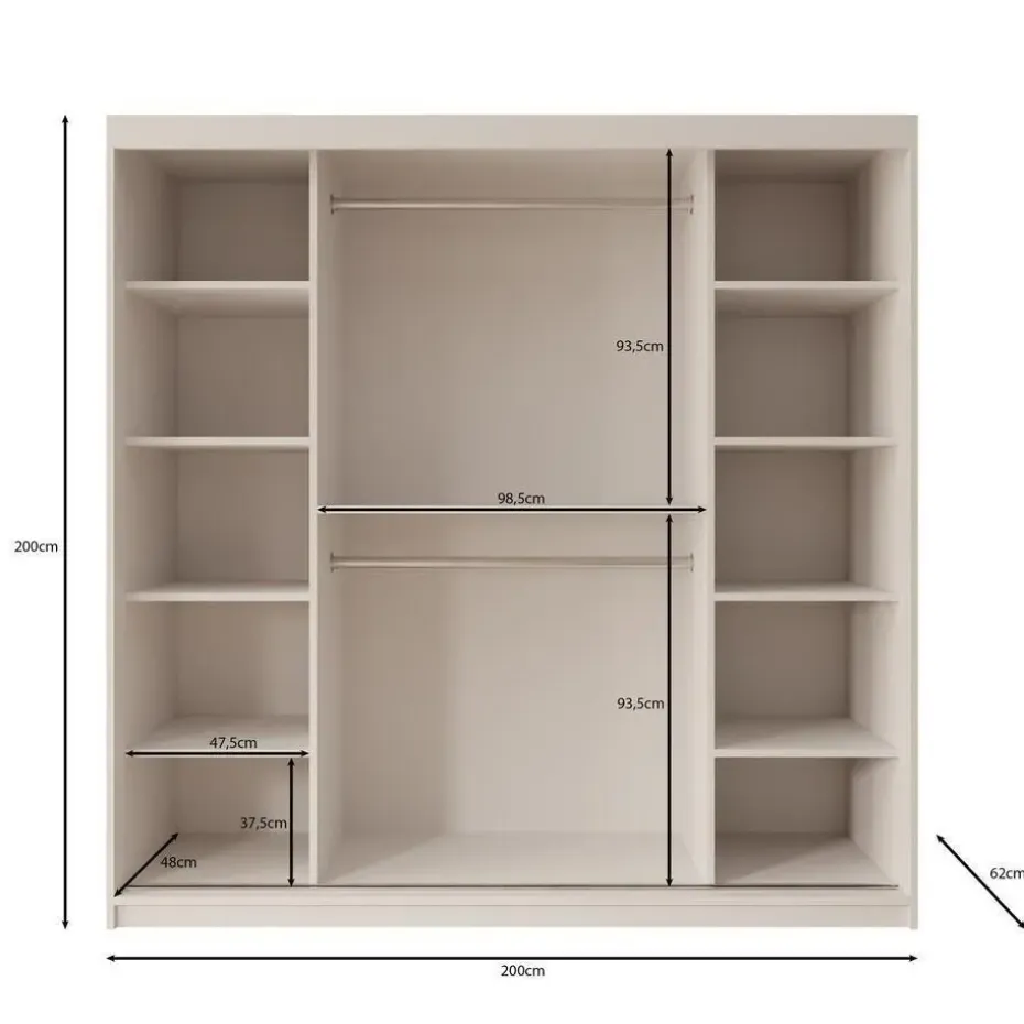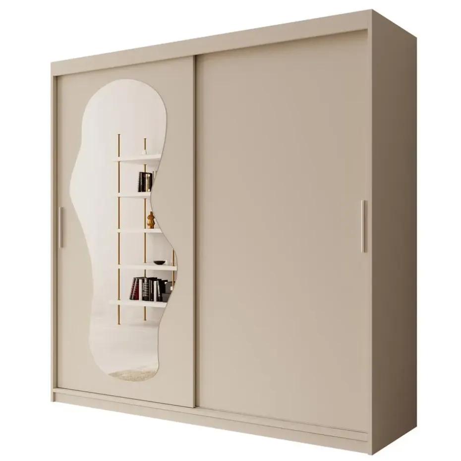 Kledingkast Ulysses beschikt over 2 schuifdeuren die openen met zilverkleurige handgrepen. De linkerdeur is voorzien van een speelse spiegel. De binnenkant bestaat uit 10 opbergvakken en 2 kledingroedes. De kast is uitgevoerd in beige kleur. Het meubel wordt ongemonteerd geleverd. Je dient het dus met behulp van de bijgeleverde handleiding zelf in elkaar te zetten.