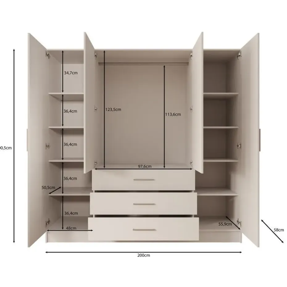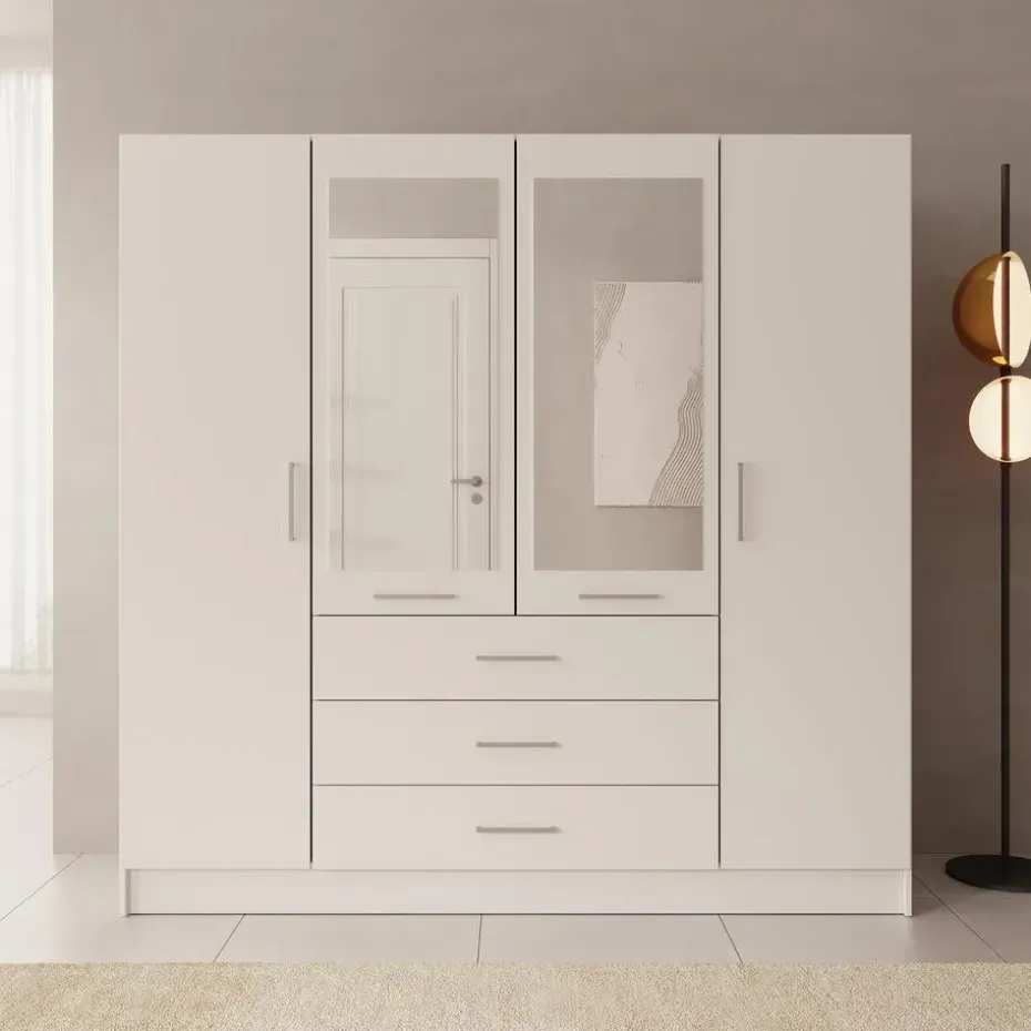 Kledingkast Komodo heeft 3 lades en 4 scharnierdeuren die openen met zilverkleurige handgrepen. Op de middelste 2 deuren is een spiegel geplaatst. De binnenkant bestaat uit 1 kledingroede en 10 opbergvakken. Het meubel is uitgevoerd in de kleur wit. Het meubel wordt ongemonteerd geleverd. Je dient het dus met behulp van de bijgeleverde handleiding zelf in elkaar te zetten.