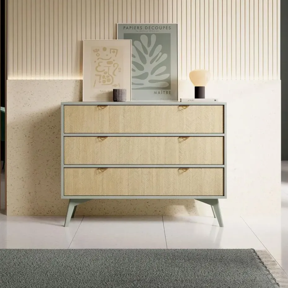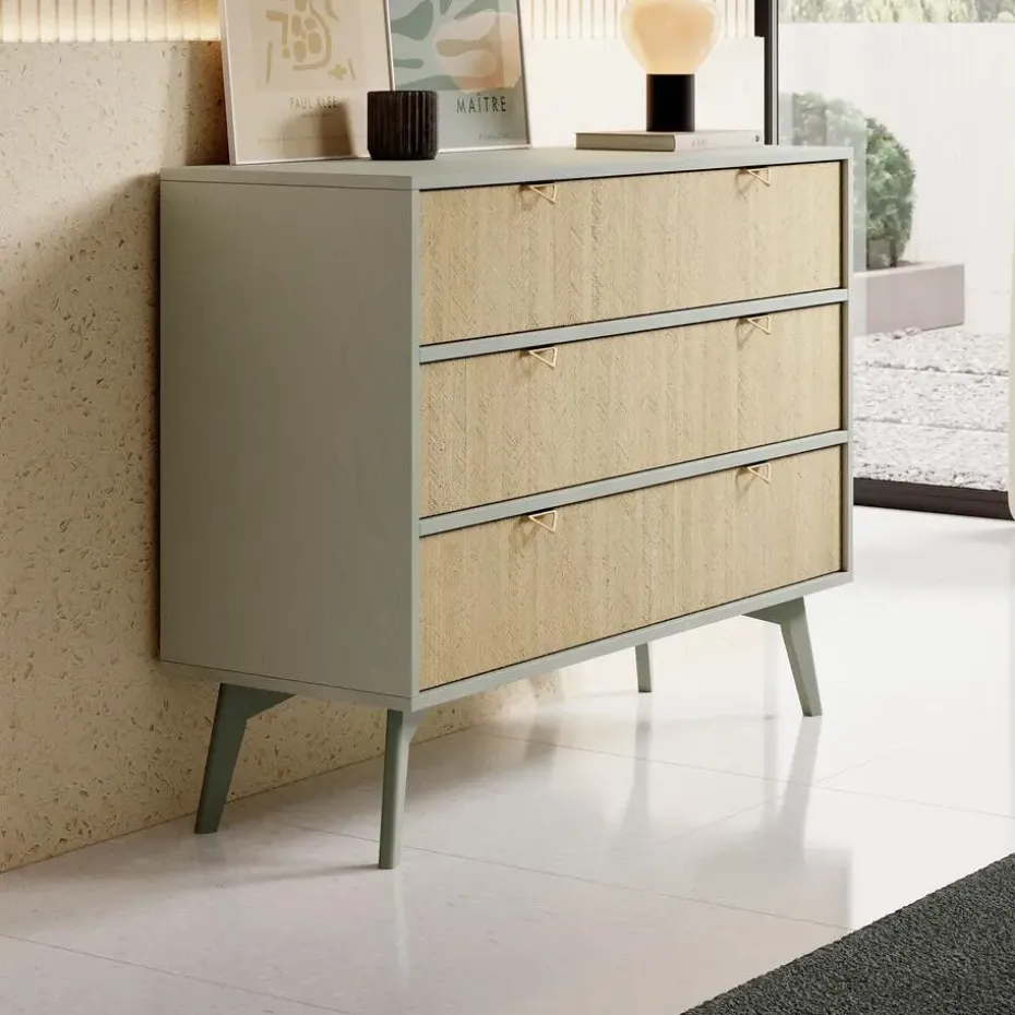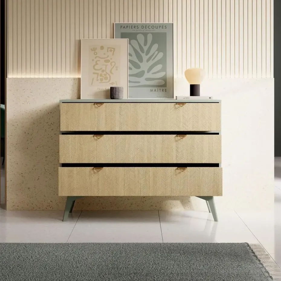 Ladekast Essence is gemaakt in een groene kleur en staat op hoge pootjes. De opbergkast beschikt over 3 lades. De voorkant van het dressoir heeft een visgraat patroon. Het meubel wordt ongemonteerd geleverd. Je dient het dus met behulp van de bijgeleverde handleiding zelf in elkaar te zetten.