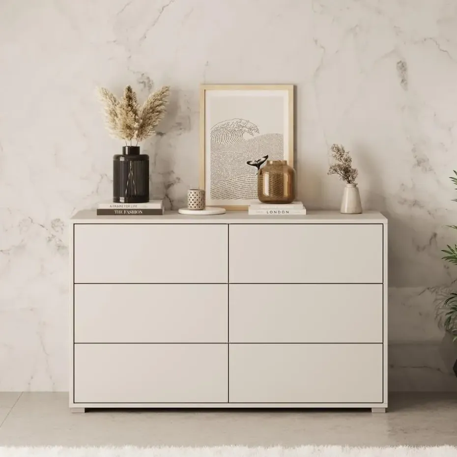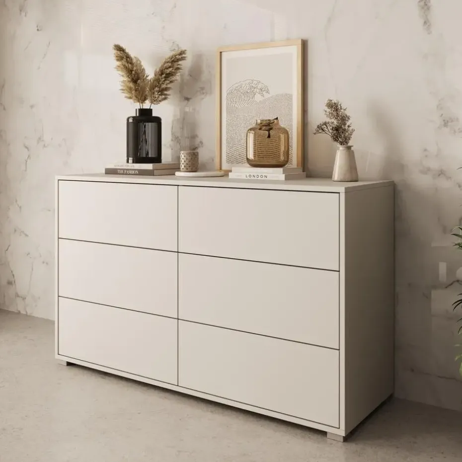 Ladekast Gideon beschikt over 6 lades die openen met het push to open systeem. De Gideon heeft een moderne uitstraling en is uitgevoerd in de kleur beige met zilverkleurige poten. Deze poten zijn gemaakt van kunststof. Het meubel wordt ongemonteerd geleverd. Je dient het dus met behulp van de bijgeleverde handleiding zelf in elkaar te zetten.
