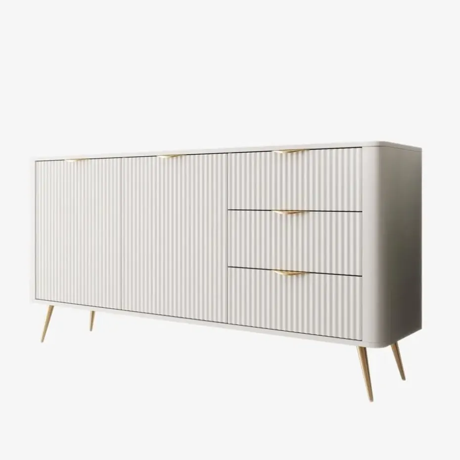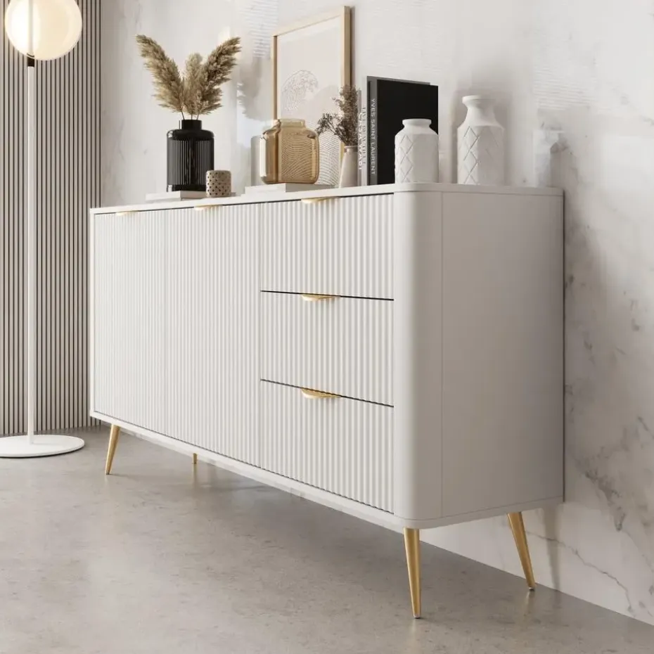 Dressoir Lima is gemaakt in een witte kleur. De opbergkast beschikt over 3 lades en 2 deuren waarachter 4 opbergvakken zitten. De lades en deuren openen met goudkleurige handgrepen. De kast staat op metalen poten. Het meubel wordt ongemonteerd geleverd. Je dient het dus met behulp van de bijgeleverde handleiding zelf in elkaar te zetten.