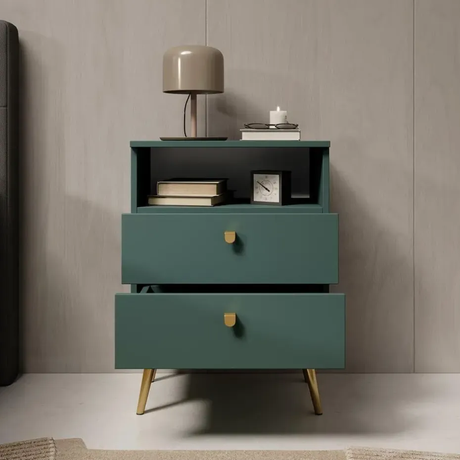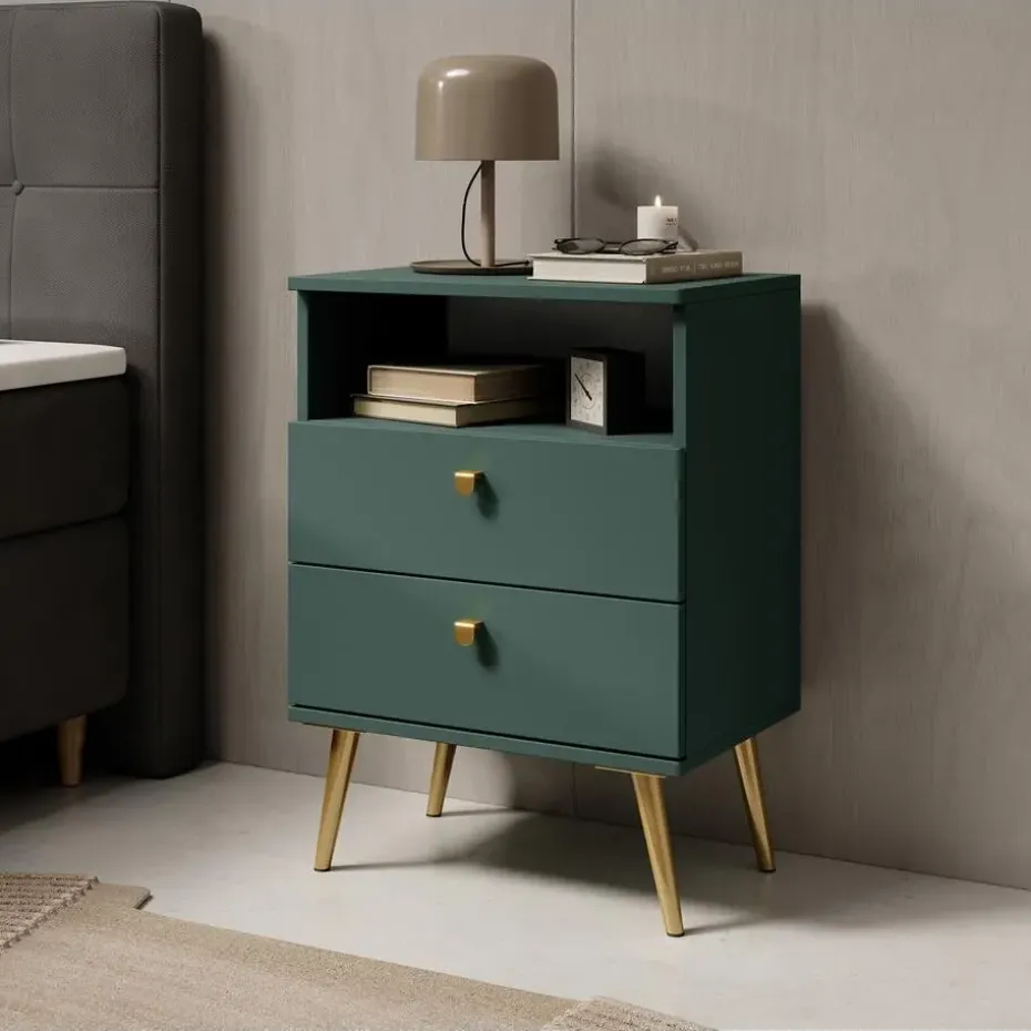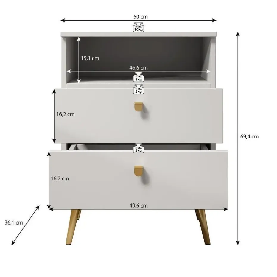 Nachtkastje Hidde heeft 2 lades en 1 open vak. De lades openen met een goudkleurige knop. Het nachtkastje staat op hoge, goudkleurige pootjes. Het meubel wordt ongemonteerd geleverd. Je dient het dus met behulp van de bijgeleverde handleiding zelf in elkaar te zetten.