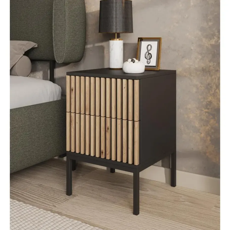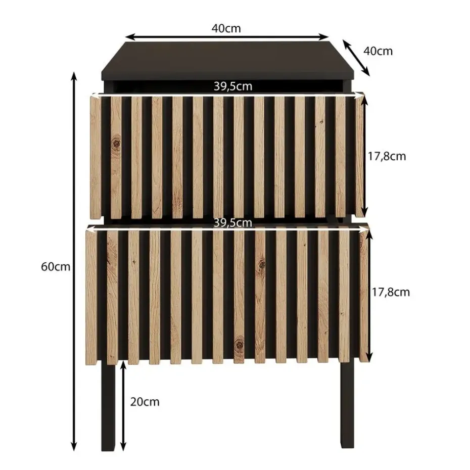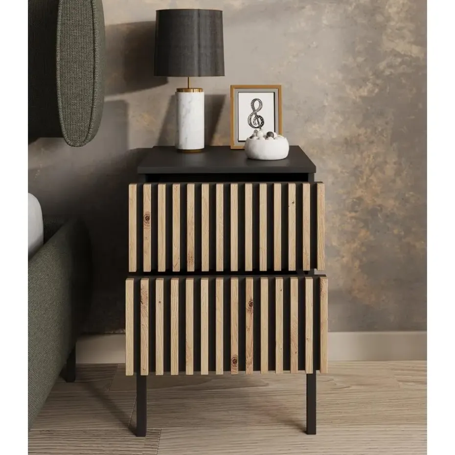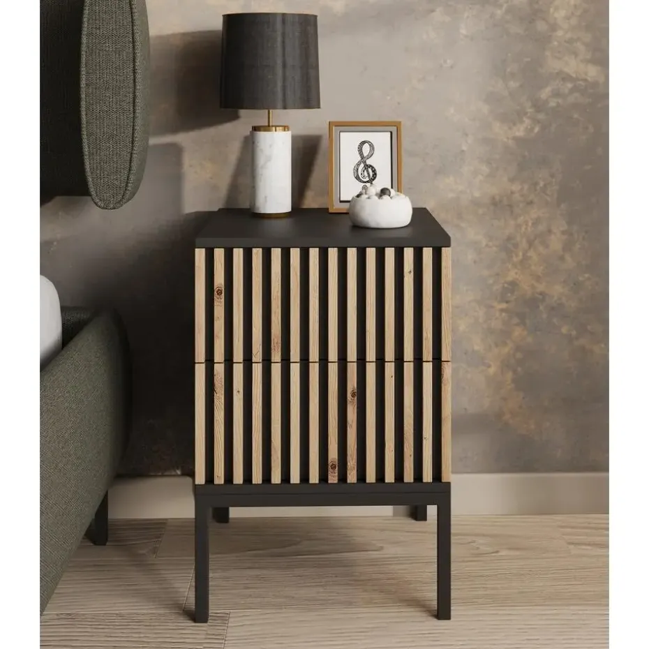Nachtkastje Marbella heeft 2 greeploze lades die op de voorkant latjes hebben. Het nachtkastje staat op pootjes van 20 cm hoog die gemaakt zijn van metaal. De Marbella is uitgevoerd in een eiken kleur met zwart. Het meubel wordt ongemonteerd geleverd. Je dient het dus met behulp van de bijgeleverde handleiding zelf in elkaar te zetten.