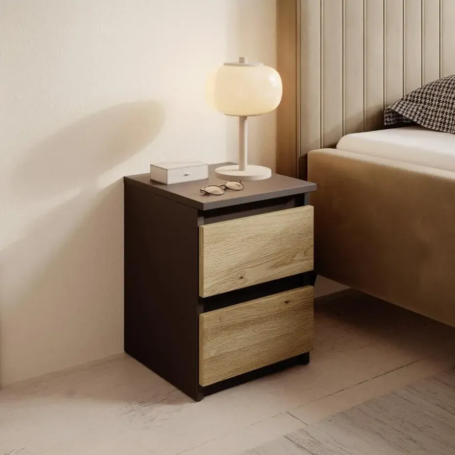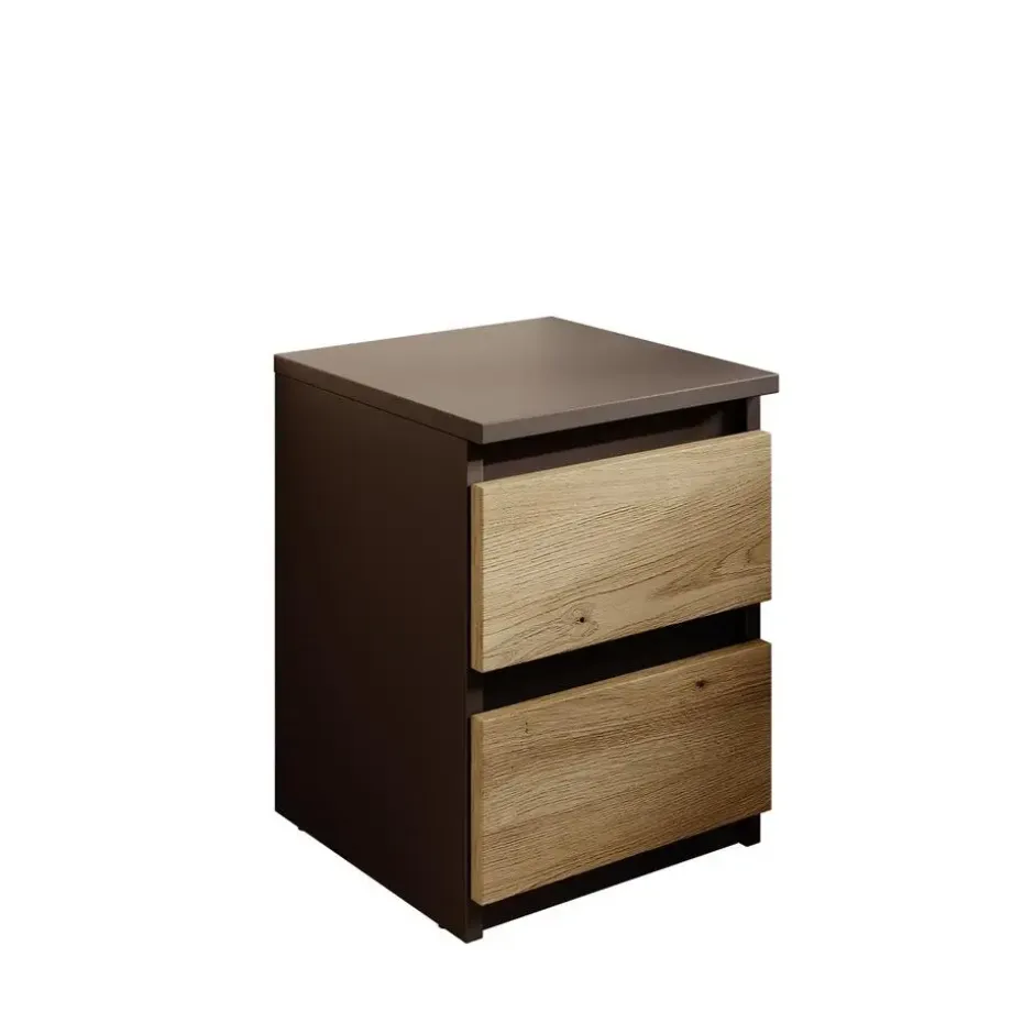 Nachtkastje Masuka beschikt over 2 lades. De lades zijn greeploos. Het kastje is uitgevoerd in antraciet met eiken kleur en heeft een moderne uitstraling. Het meubel wordt ongemonteerd geleverd. Je dient het dus met behulp van de bijgeleverde handleiding zelf in elkaar te zetten.