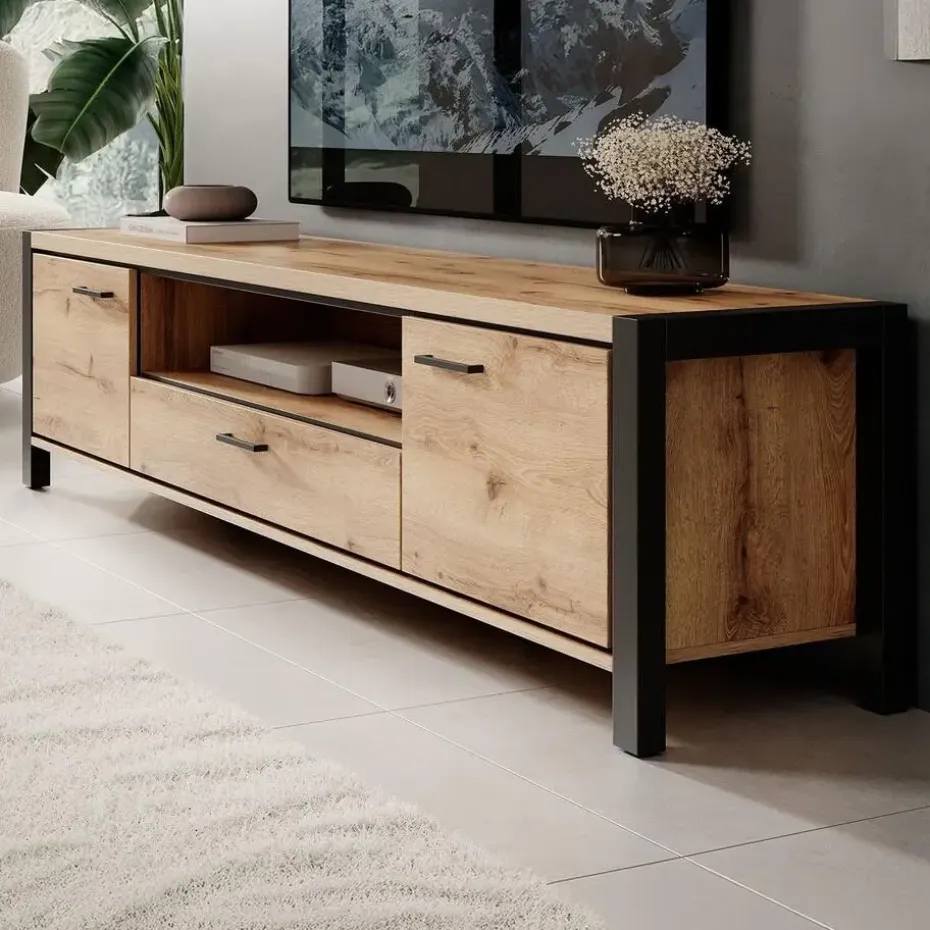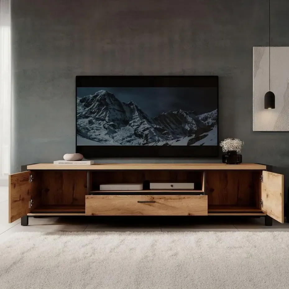 TV-Meubel Acapulco heeft 2 deurtjes en een lade. Deze openen met zwarte handgrepen. Het meubel staat op zwarte pootjes. Het meubel wordt ongemonteerd geleverd. Je dient het dus met behulp van de bijgeleverde handleiding zelf in elkaar te zetten.