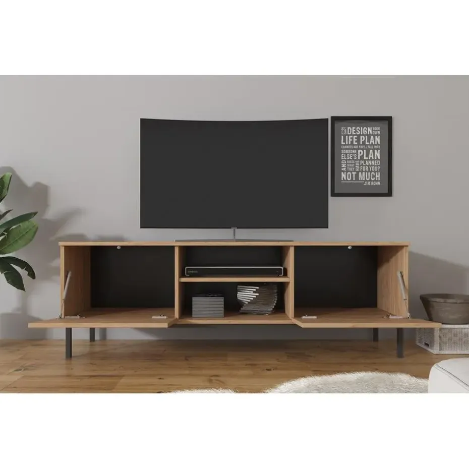 TV-Meubel Queen beschikt over 2 greeploze kleppen. Hierachter zit een opbergvak. In het midden zitten 2 open vakken. Het meubel staat op hoge, zwarte pootjes. Het meubel wordt ongemonteerd geleverd. Je dient het dus met behulp van de bijgeleverde handleiding zelf in elkaar te zetten.