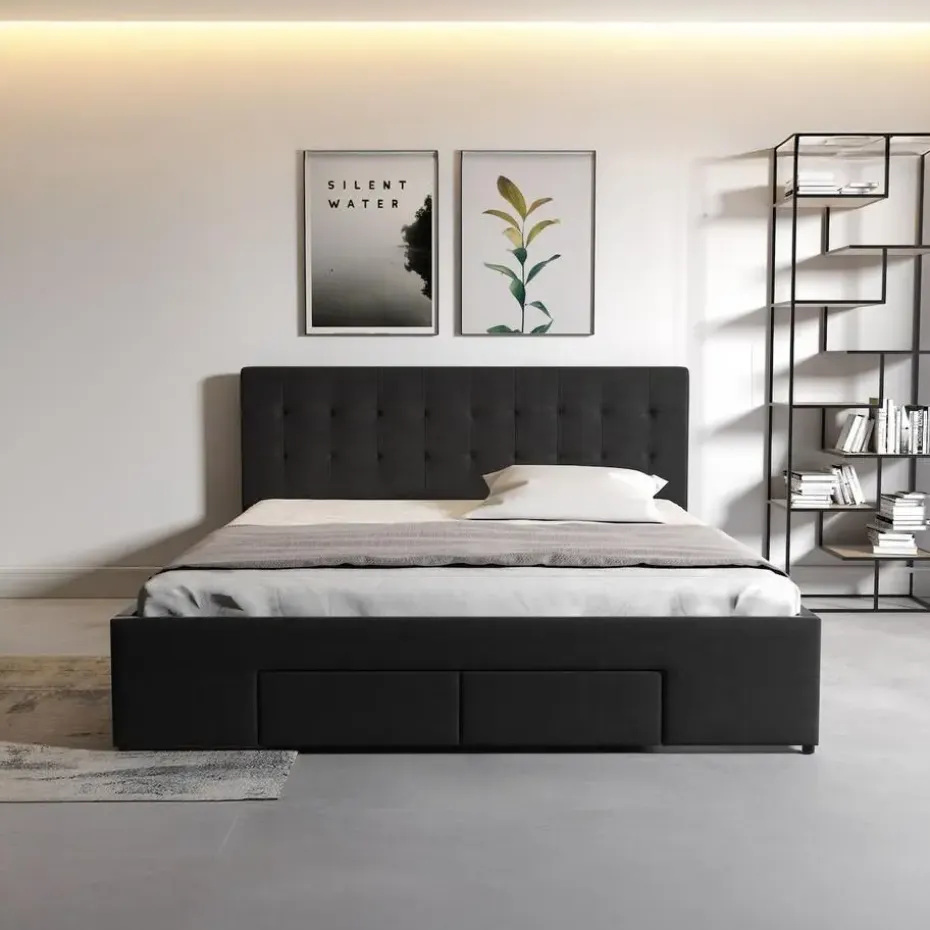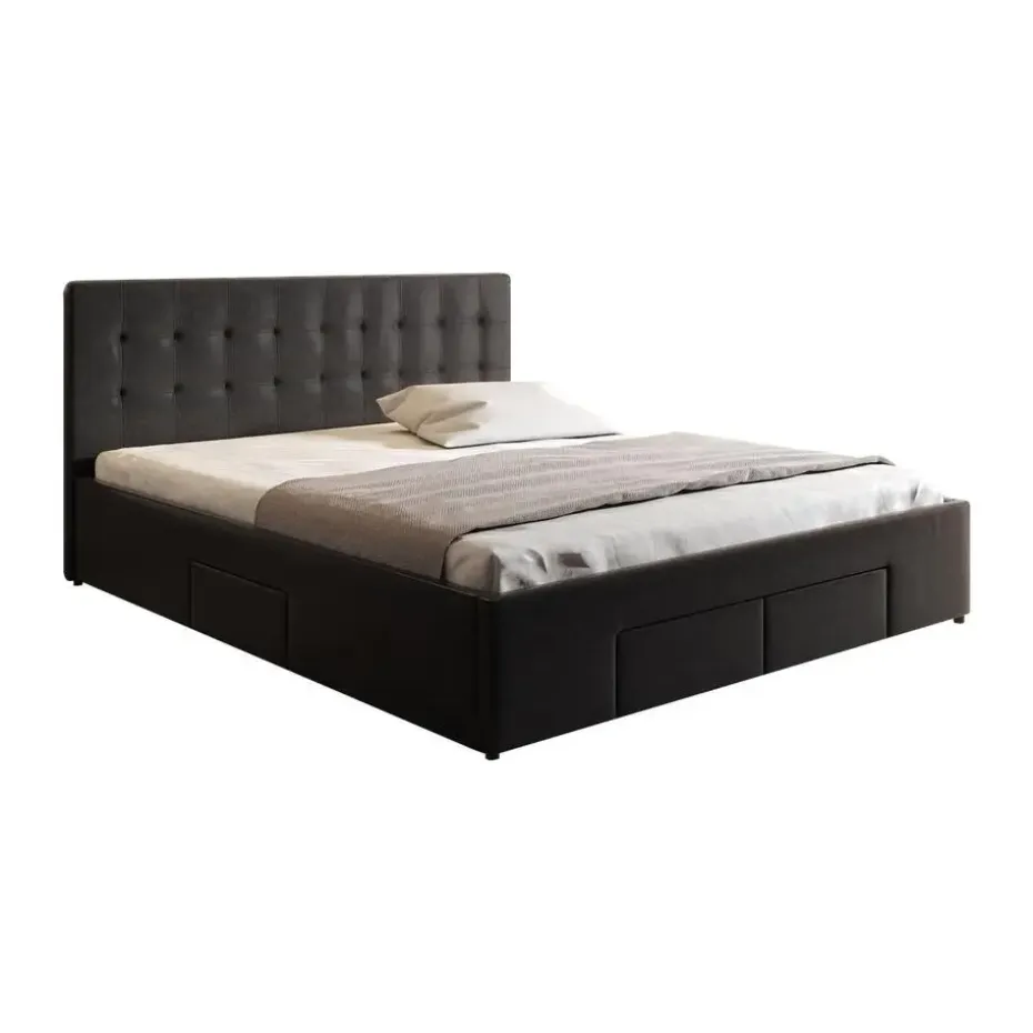 Tweepersoonsbed Milo is gemaakt van stevig kunstleer in zwarte kleur. Het bed wordt met lattenbodem geleverd en is geschikt voor matrasmaat 180×200 cm. In het voetenbord en de zijkanten zitten lades op wieltjes. Het meubel wordt ongemonteerd geleverd. Je dient het dus met behulp van de bijgeleverde handleiding zelf in elkaar te zetten.