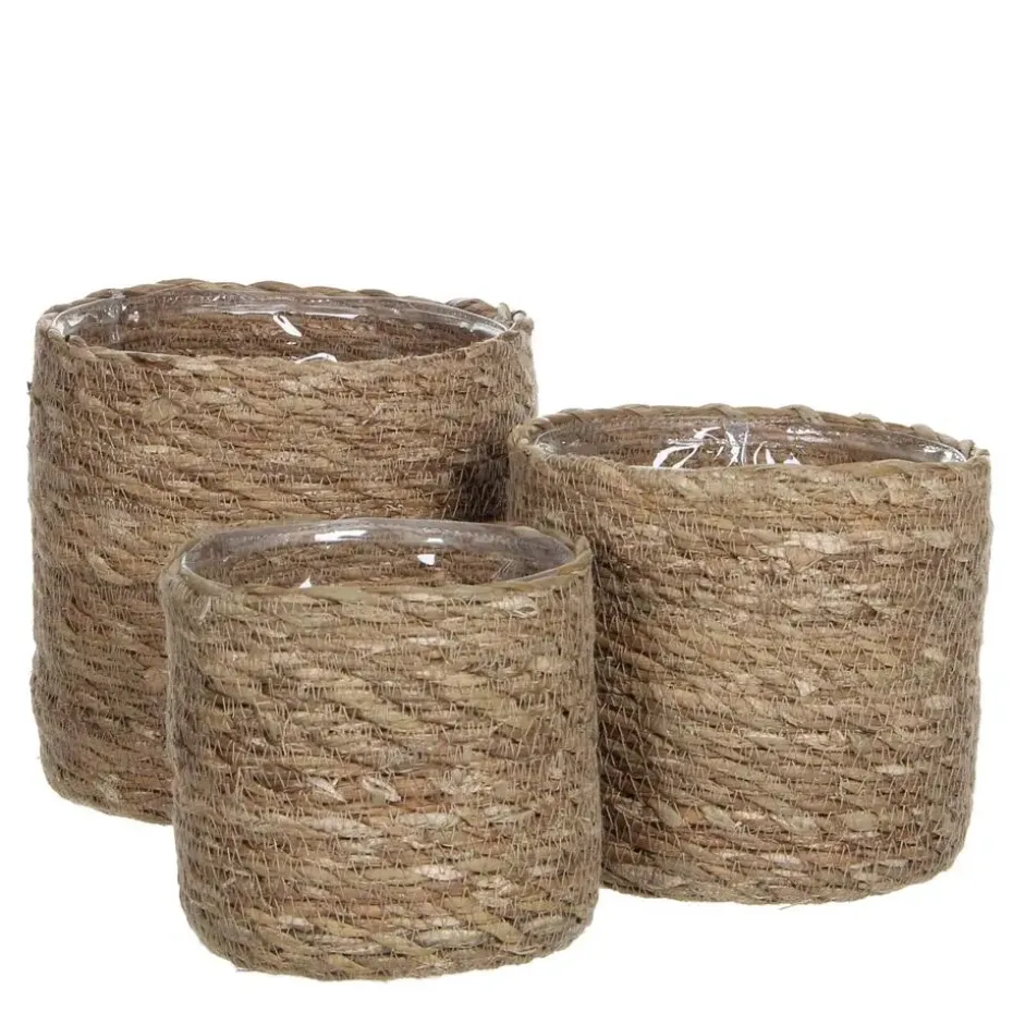 Set van drie plantenmandenAfmetingen: H12 x Ø12 cm, H14 x Ø14 cm en H16 x Ø16 cmGemaakt van natuurlijk zeegrasGevoerd met een plastic liner voor extra beschermingGeven je interieur een botanische lookDe manden uit de Atlantic serie van Mica Decorations zijn gemaakt van natuurlijk zeegras. De strengen worden in elkaar gedraaid, wat zorgt voor extra stevigheid. Door het natuurlijke materiaal en de lichtbruine kleur hebben de manden een botanische look dat elk interieur sfeer geeft. Ter bescherming zijn ze gevuld met een plastic binnenlaag. Hierdoor zijn de manden erg geschikt om als bloempot te gebruiken, of berg er wat dingetjes in op. Deze set bestaat uit drie manden van H12 x Ø12 cm, H14 x Ø14 cm en H16 x Ø16 cm.