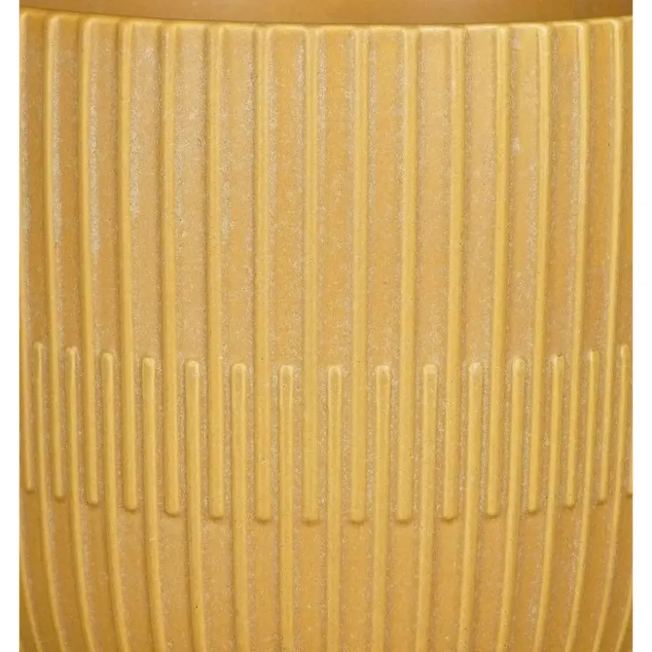 Plantenpot/bloempot van keramiek in de kleur mat okergeel met een mooi verticale strepen patroon. Diameter 14 cm en hoogte 13 cm. Stijlvolle bloempotten voor binnen gebruik. Serie: Sara. De stijlvolle pot met het prachtige patroon aan de buitenzijde is met de hand gemaakt in Portugal. Derhalve is geen pot exact hetzelfde en hebben de bloempotten een echt karakter. Tip: zet een schotel onder de pot om eventueel lekken tegen te gaan. Potten van steen zijn niet 100% waterdicht.