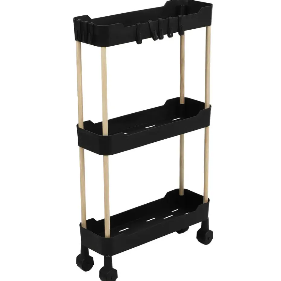 Keuken/badkamer opberg trolley van Modern Spirit. De 3-laags opberg trolley is de perfecte oplossing voor extra opbergruimte in je keuken, badkamer, hobbyruimte of kantoor. Met drie stevige mesh-manden, een stabiel houten frame en een strak zwart design is deze trolley zowel functioneel als stijlvol. Dankzij de soepele wieltjes verplaats je hem eenvoudig naar waar je hem nodig hebt.