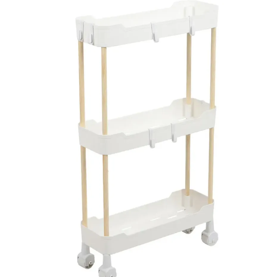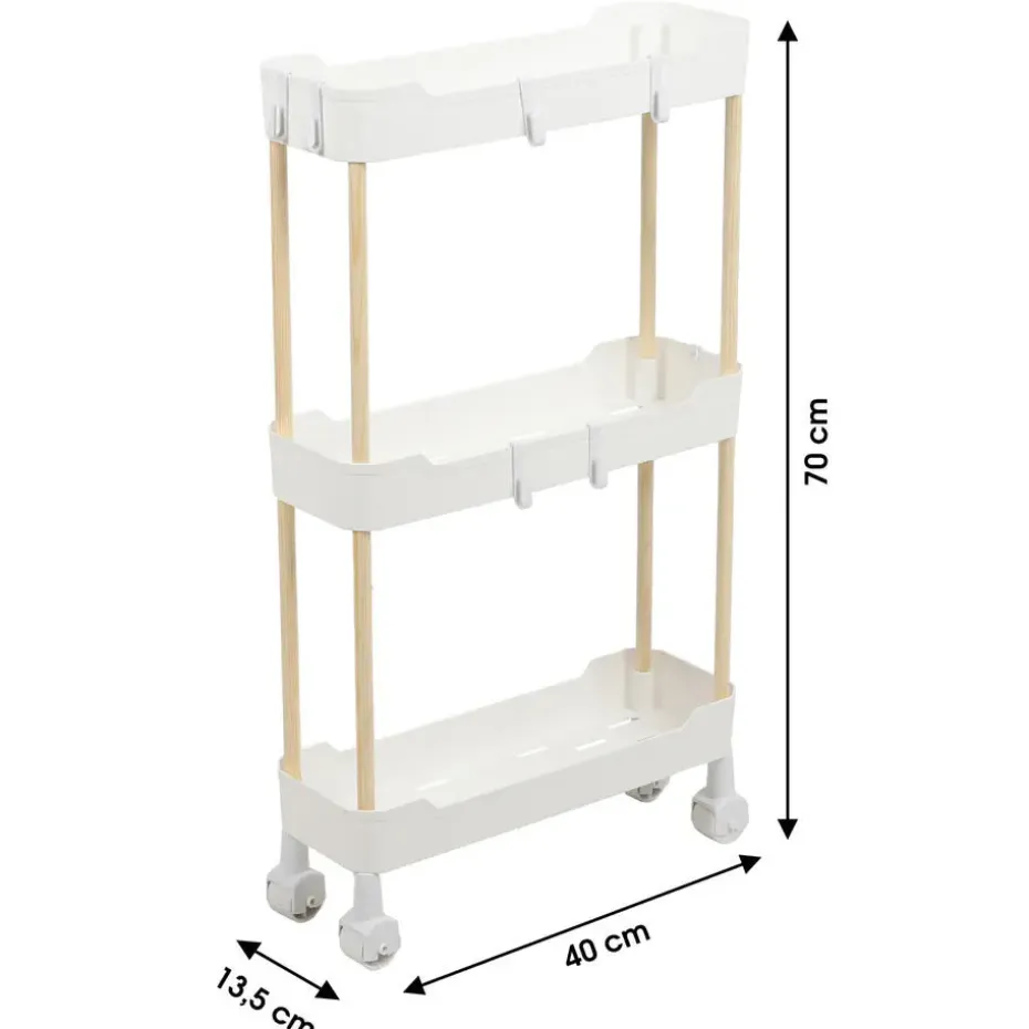Keuken/badkamer opberg trolley van Modern Spirit. De 3-laags opberg trolley is de perfecte oplossing voor extra opbergruimte in je keuken, badkamer, hobbyruimte of kantoor. Met drie stevige mesh-manden, een stabiel houten frame en een strak wit design is deze trolley zowel functioneel als stijlvol. Dankzij de soepele wieltjes verplaats je hem eenvoudig naar waar je hem nodig hebt.