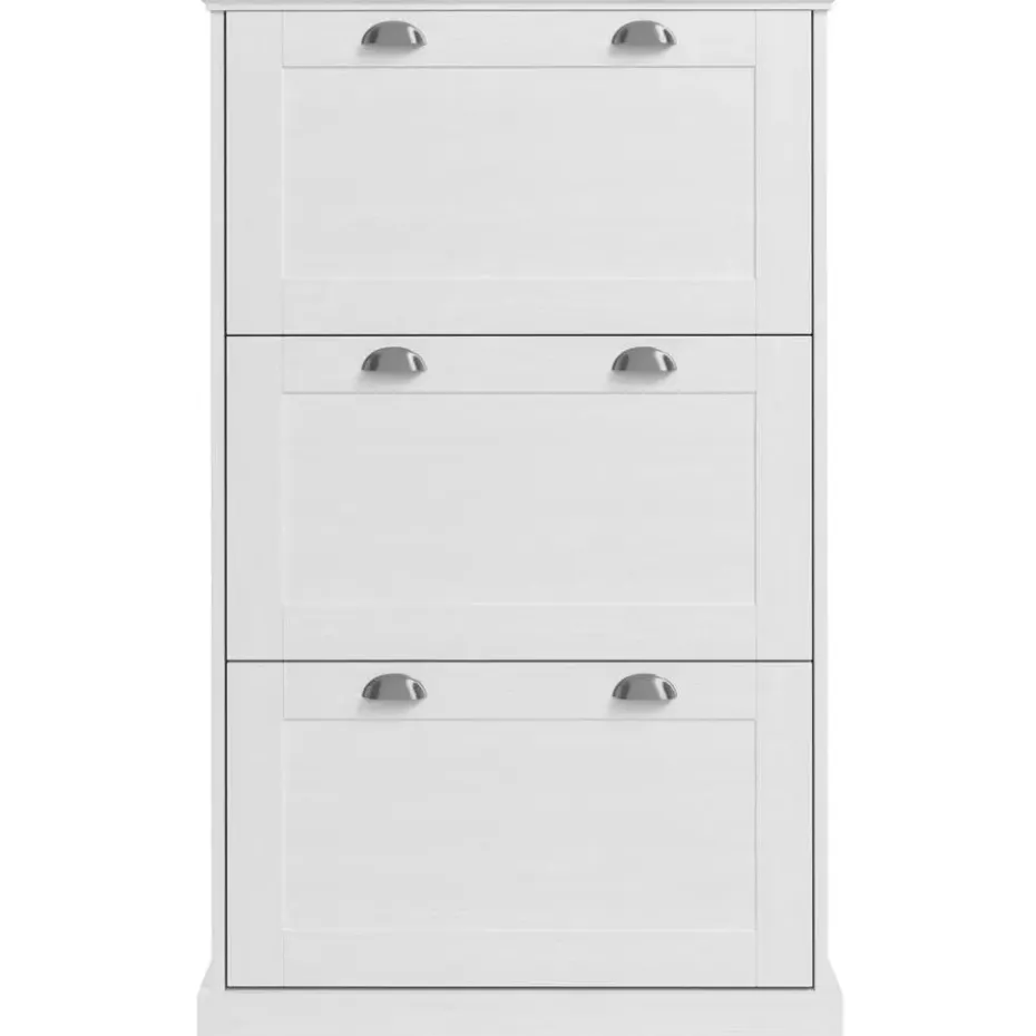Deze elegante schoenenkast heeft drie kleppen, wat veel opbergruimte biedt voor je schoenen. De witte afwerking voegt een vleugje elegantie toe aan elke gang of entree.