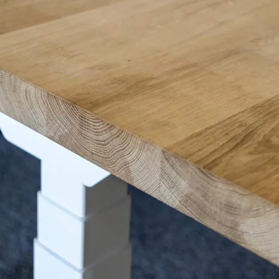 Bij onze massief eiken bladen wordt de stam in planken (lamellen) gezaagd, waarna ze onder hoge druk aan elkaar worden gelijmd. Hierdoor wordt het eiken blad erg stevig. Onze 160×80 en 180×90 bladen zijn voorzien van staalprofielen aan de onderkant, om zo natuurlijke werking te voorkomen.