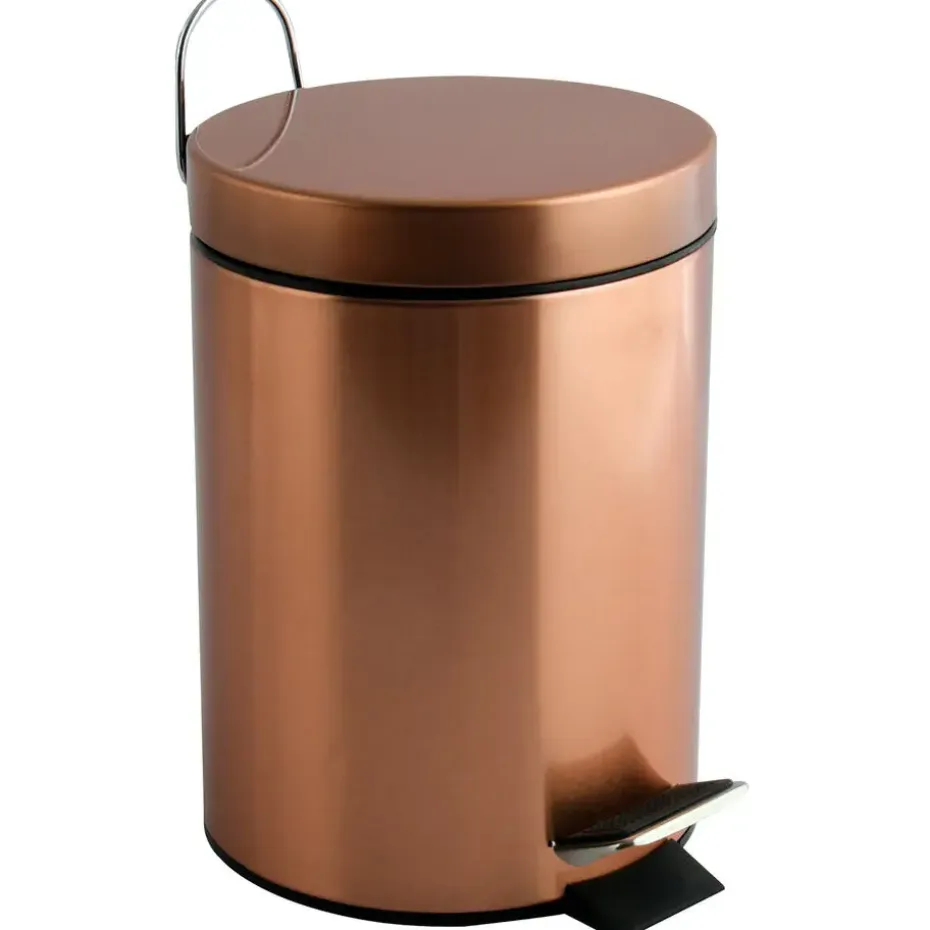 Pedaalemmer voor badkamer en toilet, klein model met inhoud 3 liter in koper kleur. Deze prullenbak is gemaakt van rvs en metaal en heeft een formaat van ca. L17 x H25 cm. Deze kleine pedaalemmers hebben een uitneembare binnenbak. Luxe glanzende glimmende finish.