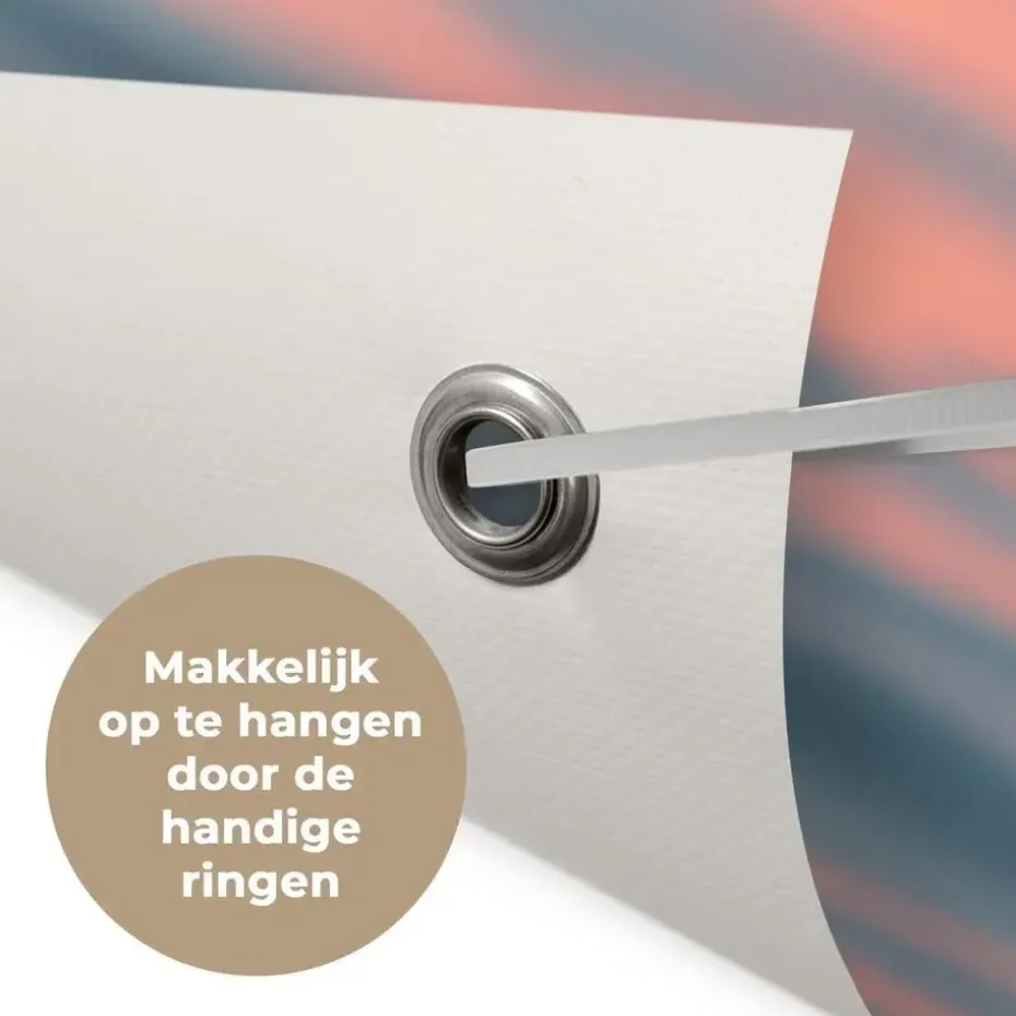 Tuinposters, ook wel tuindoek genoemd, zijn posters die specifiek geschikt zijn om buiten op te hangen. Dit tuindoek kan daarom tegen een stootje. Voor deze buitenposter is bisonyl zeil gebruikt. Dit zeil is een gecoat zeildoek met een fraaie afwerking. De tuinposter is UV-bestendig, waardoor deze niet verkleurt in de zon. In het doek zijn meerdere ringen geplaatst waardoor je het gemakkelijk op kan hangen! Tot een formaat van 120×80 cm zijn de ringen in de hoeken, bij grotere formaten komen de ringen om de 60 cm. Het doek kan uitstekend tegen de verschillende weersinvloeden en blijft gegarandeerd 3 jaar goed.
