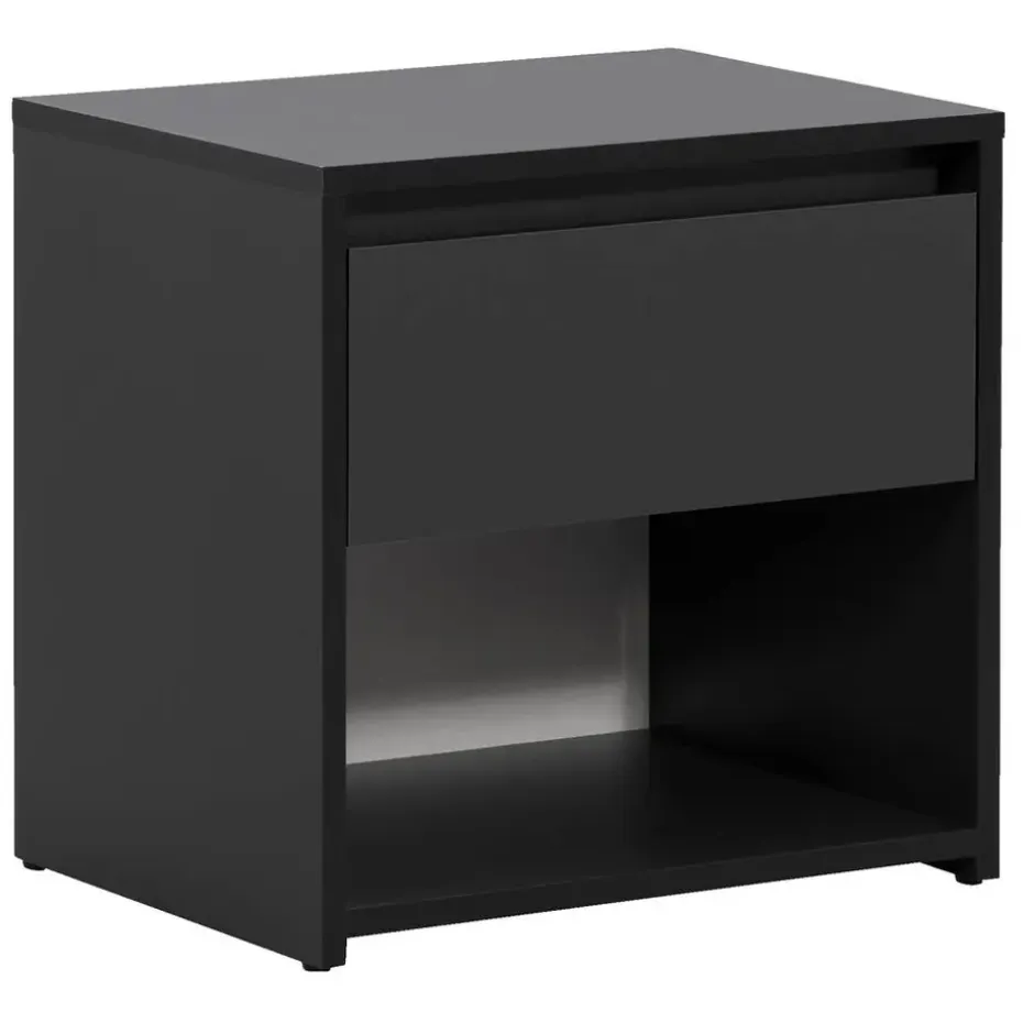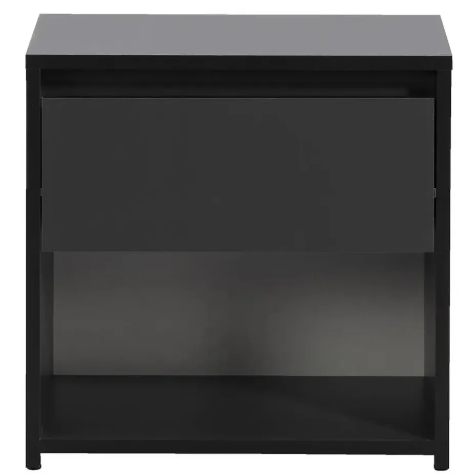 Creëer rust en eenheid in je slaapkamer met nachtkastje Lyon. De stijlvolle zwarte kleur maakt dit nachtkastje geschikt voor verschillende interieurstijlen. Er is voldoende ruimte voor het opbergen van kleine spullen, zoals de afstandsbediening of een boek, in de lade en in het praktische open vak. Combineer nachtkastje Lyon met het bijpassende bed en maak zo je slaapkamer helemaal compleet.