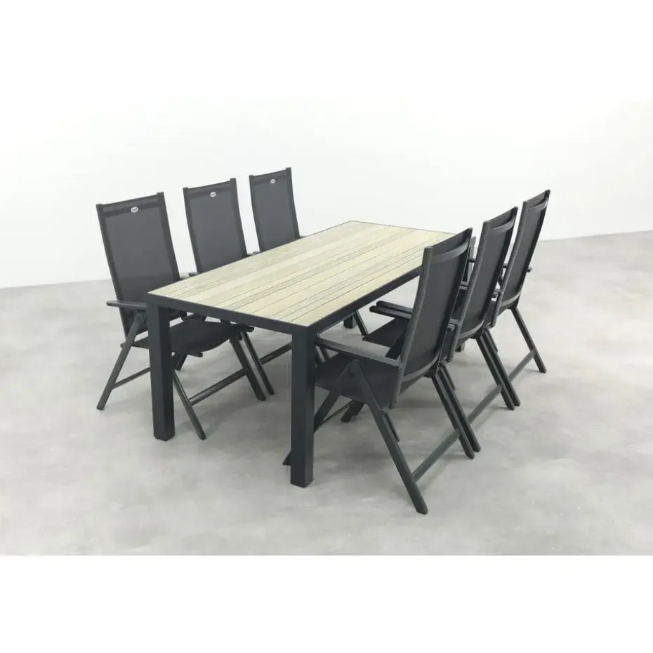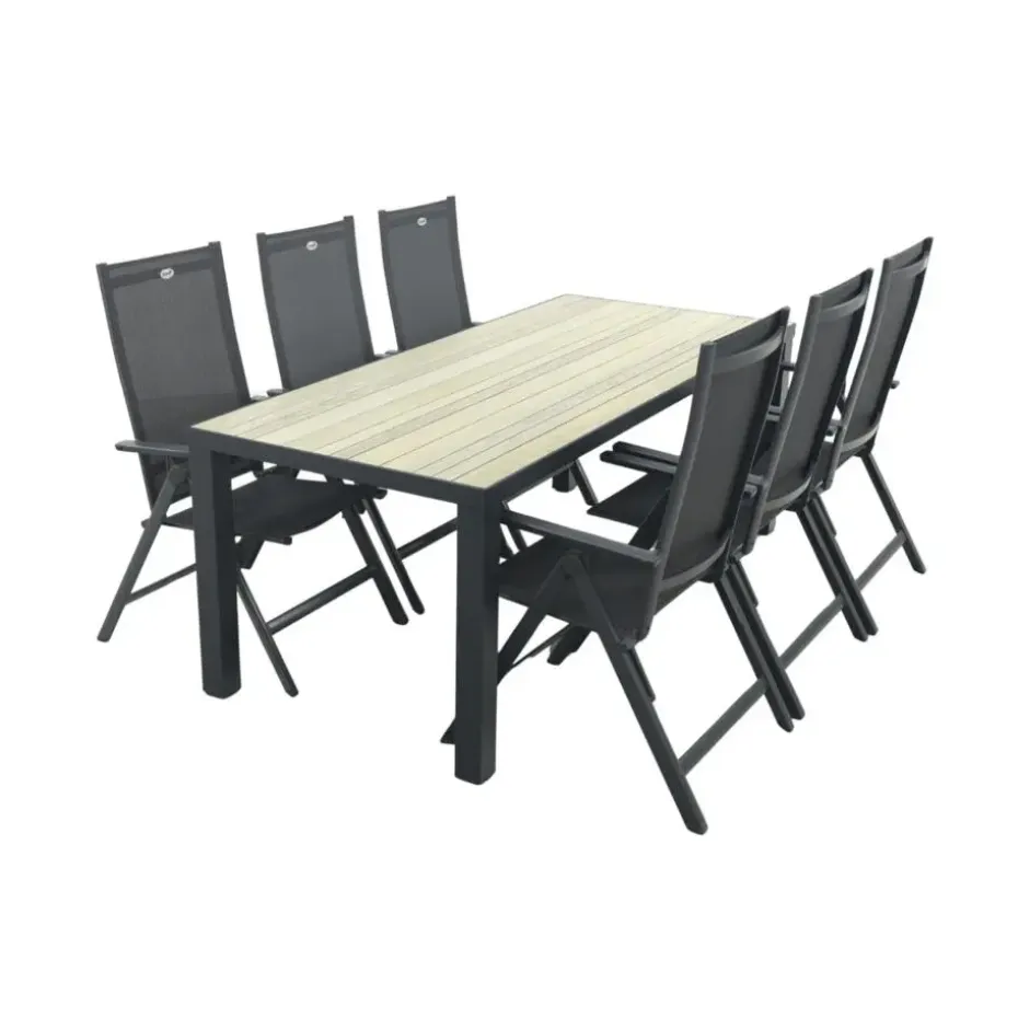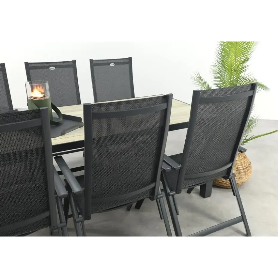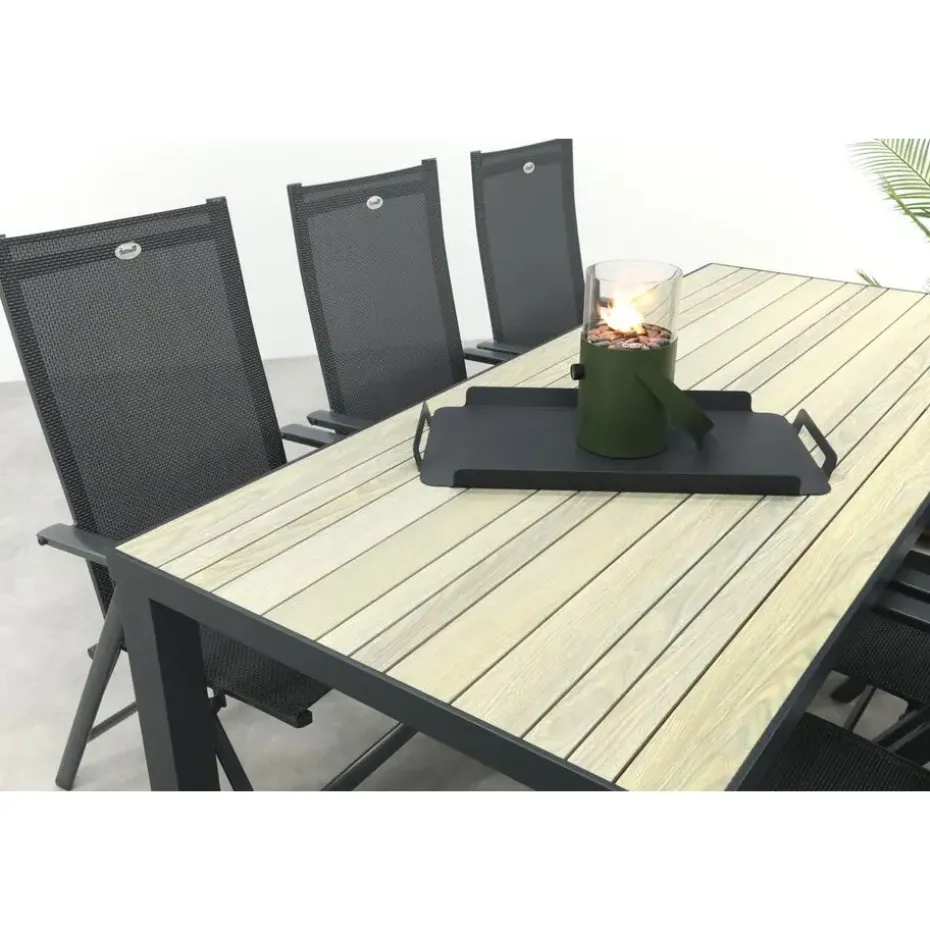 De Nola tuintafel is gemaakt van aluminium, een materiaal dat bekendstaat om zijn stevigheid en weerbestendigheid. Het tafelblad heeft een realistische houtlook die zorgt voor een warme en natuurlijke sfeer in je tuin, zonder het onderhoud dat echt hout vereist. Regen, zon of wind? Geen probleem, deze tafel blijft er mooi uitzien. De royale afmeting van 210×90 cm biedt voldoende ruimte voor gezellige diners of borrels. En goed om te weten: de Nola is ook verkrijgbaar in twee andere formaten (90x90en160x90 cm.), zo kies je altijd de maat die past bij jouw tuin.