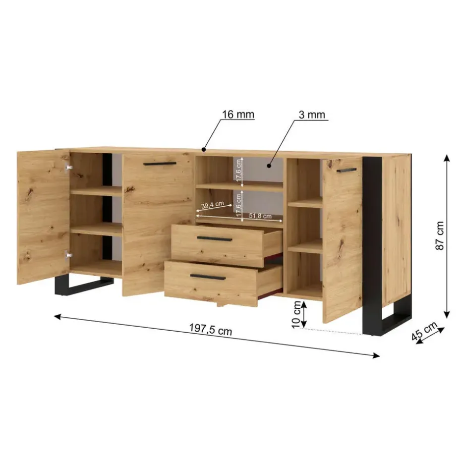 De stijlvolle NUKA commode met trendy accenten voor de woonkamer of slaapkamer is een echt meesterwerk van design. Zijn moderne uitstraling en aangename kleurenpalet maken het perfect geschikt voor verschillende interieurs. Grote zwarte poten in framevorm voegen karakter toe aan het meubel en vormen een uitstekend contrast met de rest. De commode heeft twee gesloten planken aan de zijkanten, inclusief één dubbele plank, wat zorgt voor veel ruimte om verschillende voorwerpen op te bergen. Daarnaast zijn twee open planken ideaal voor het tentoonstellen van decoraties of favoriete boeken, terwijl twee laden extra functionaliteit bieden. Zwarte handgrepen van het boxsysteem completeren het elegante uiterlijk van de commode, waardoor een samenhangend geheel ontstaat. De karakteristieke poten, ondersteund door een extra steun in het midden, garanderen stabiliteit, waardoor dit meubel niet alleen visueel aantrekkelijk is, maar ook praktisch en duurzaam in uw interieur.