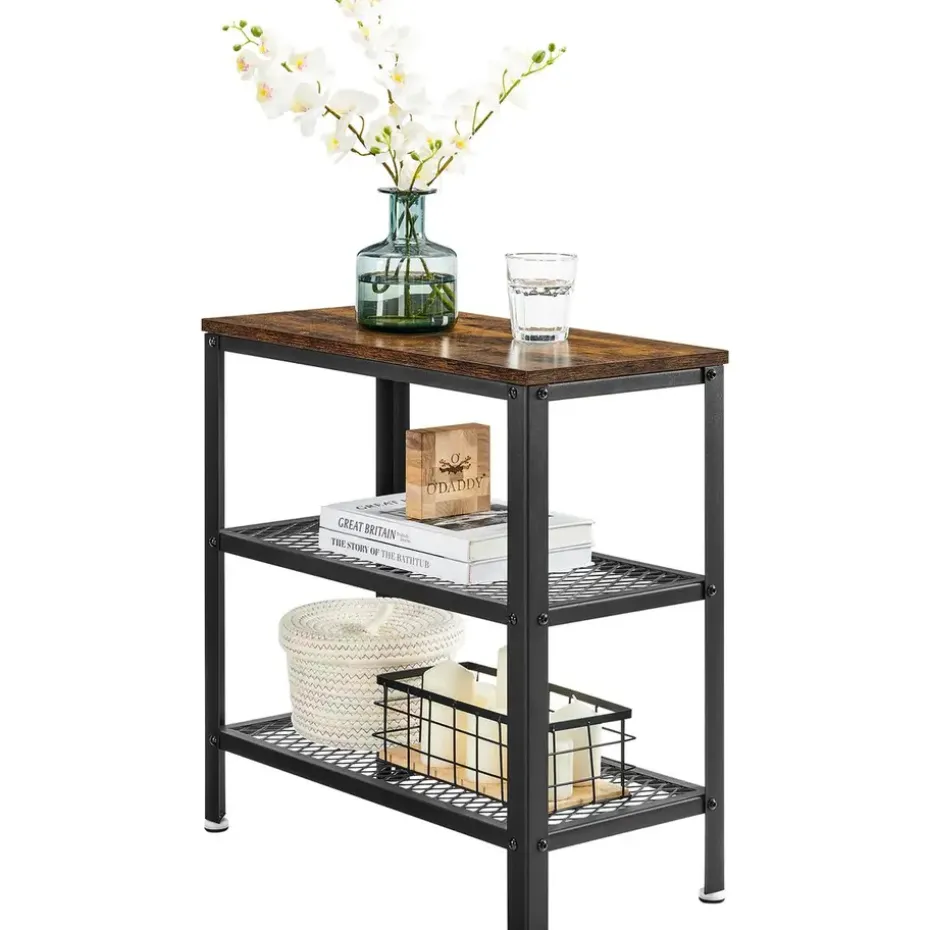 Ken je dat gevoel van ruimtegebrek in huis waar je net dat ene handige tafeltje mist voor je boeken, decoraties of een kopje koffie? De O’DADDY® industriële wandtafel biedt de perfecte oplossing. Met zijn compacte formaat van 60 x 30 x 60 cm past deze stijlvolle bijzettafel in elke hoek van je huis, of het nu in de hal, woonkamer of naast je bed is. Dankzij het rustieke bruine blad en de zwarte ijzeren accenten, voeg je met deze tafel direct een vleugje industriële charme toe aan je interieur. De 3 stevige niveaus bieden genoeg ruimte voor je spullen, zonder dat het rommelig oogt.