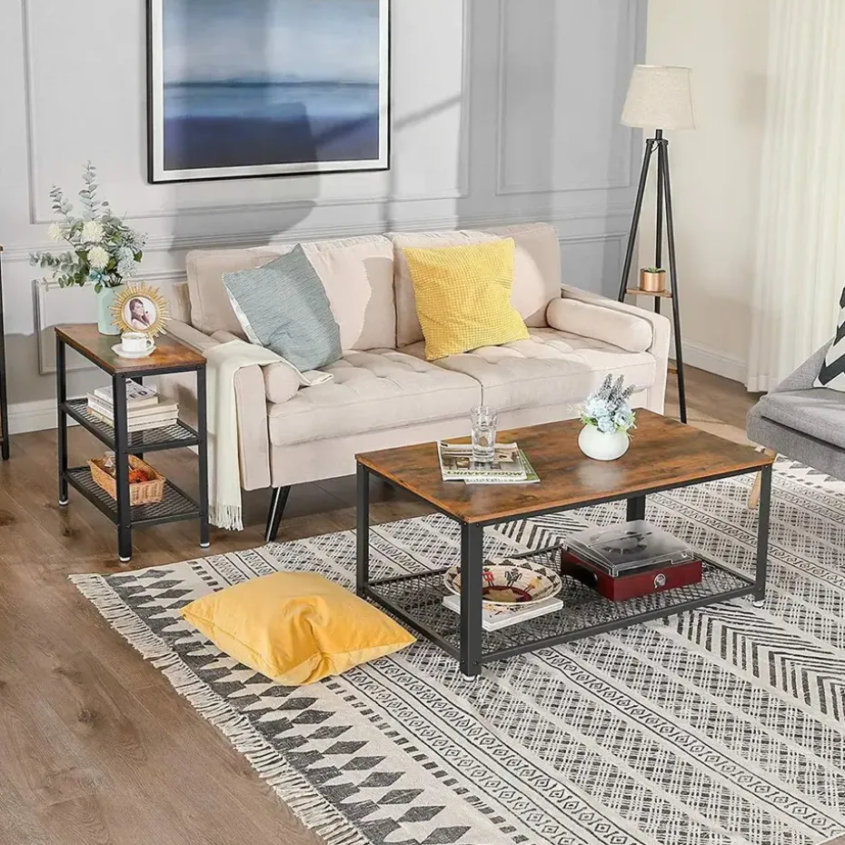 Het rustieke bruine tafelblad gecombineerd met het stevige zwarte metalen frame zorgt voor een stijlvol contrast dat in elk interieur past. De metalen rasterplanken bieden niet alleen een industriële uitstraling, maar zijn ook zeer functioneel om items stabiel en veilig op te bergen. Door het robuuste design kun je met deze tafel jarenlang genieten van een stabiel en stevig meubelstuk dat zijn charme behoudt.