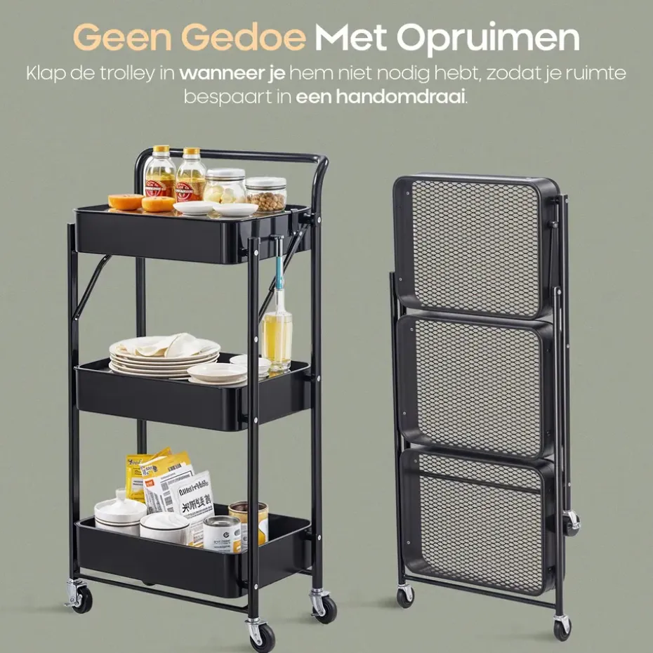 - Inklapbaar ontwerp: Bespaar ruimte door de trolley eenvoudig in te klappen en op te bergen wanneer hij niet nodig is.