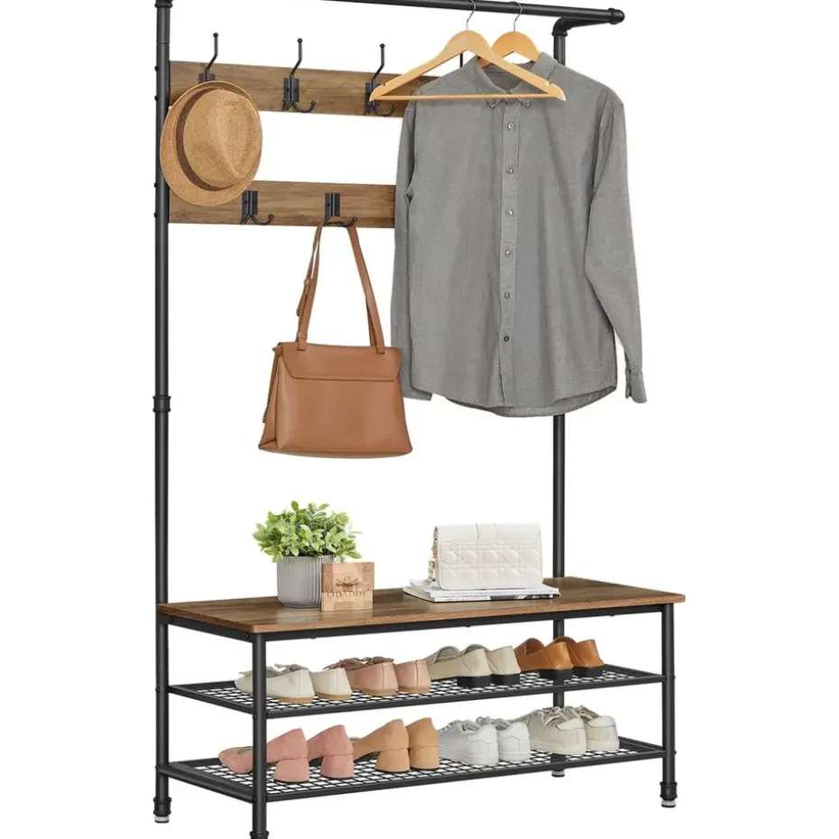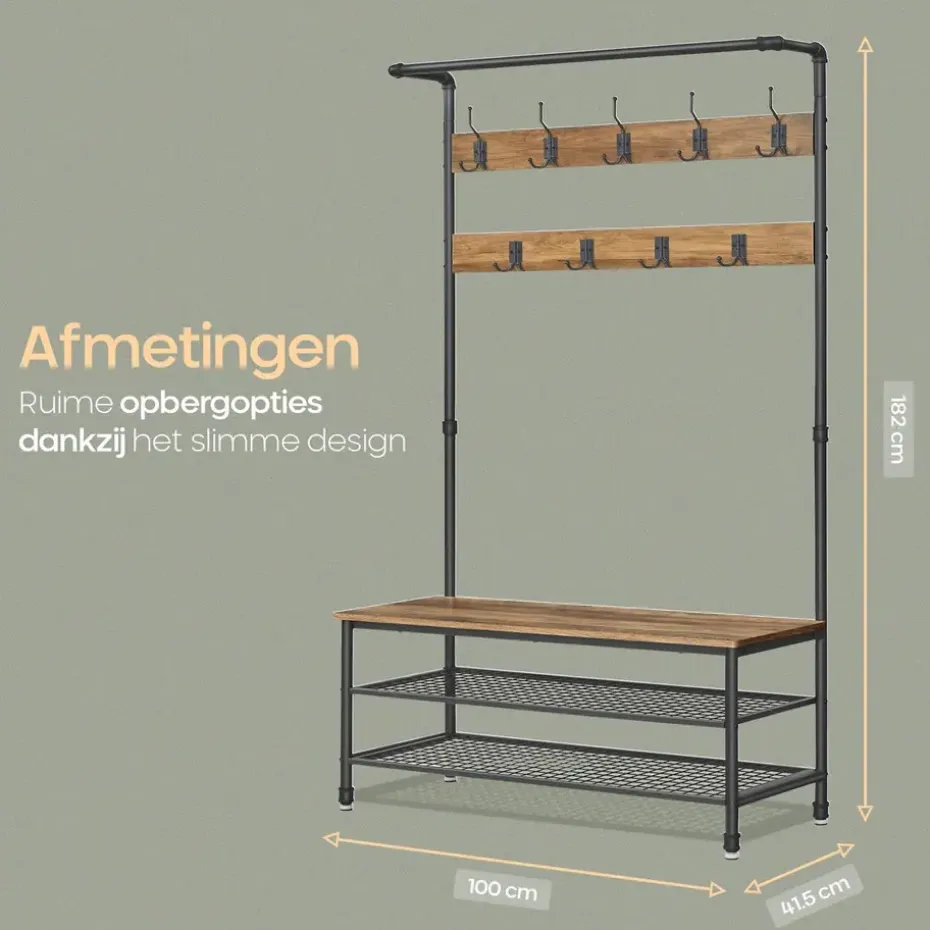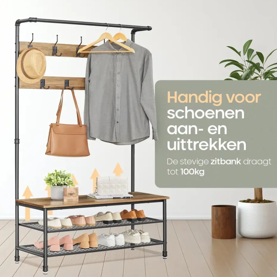 De combinatie van gepoedercoat metaal en hout in een rustieke stijl zorgt voor een stevig en duurzaam meubel. Het metaal is beschermd tegen roest, terwijl de houten planken een stijlvolle en beschermende fineerlaag hebben. De bank biedt niet alleen een comfortabele zitplek, maar kan ook tot 100 kg dragen, waardoor hij perfect is voor dagelijks gebruik. De stevige haken kunnen elk tot 3 kg dragen, zodat ook zware winterjassen gemakkelijk opgehangen kunnen worden.
