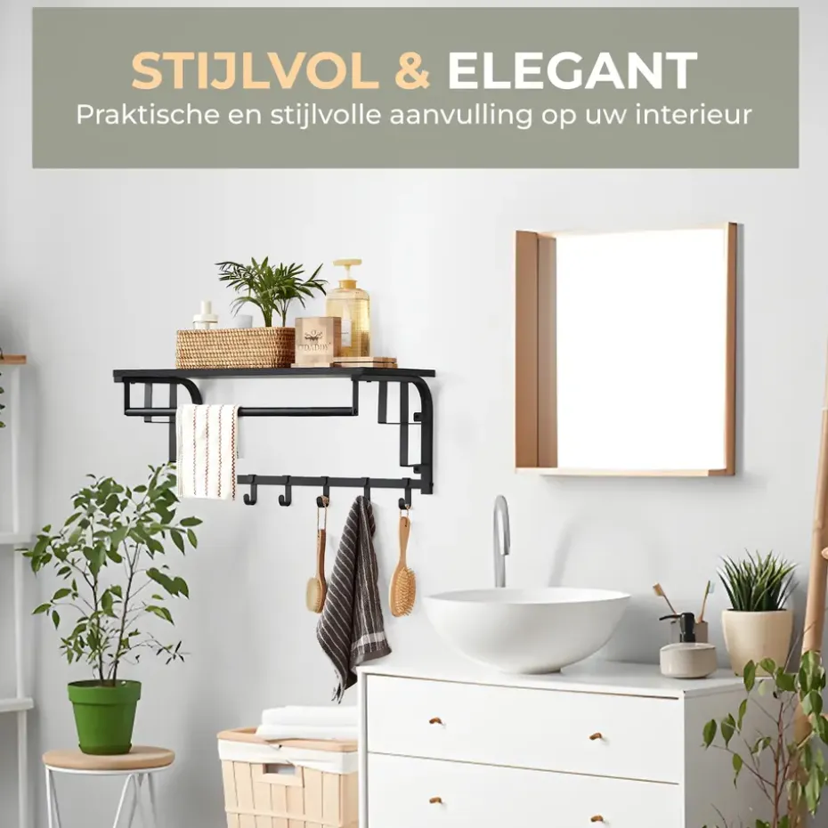 - Drie-in-één design met plank, ophangrail en 5 haken voor al je spullen.