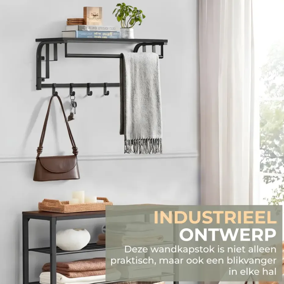 Met deze betaalbare wandkapstok maak je optimaal gebruik van je muur. De grote plank van 66 x 30 cm biedt ruimte voor decoratieve items zoals planten, fotolijsten of zelfs boeken, waardoor het niet alleen een kapstok is, maar ook een stijlvolle aanvulling op je interieur. De 5 stevige haken zorgen ervoor dat je jassen, tassen of sleutels altijd binnen handbereik zijn. Daarnaast biedt de ophangrail extra flexibiliteit, ideaal voor kledinghangers of sjaals.