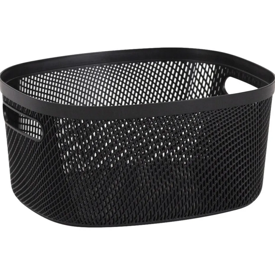 Opbergmand Mesh in antraciet heeft een inhoud van 6,7 liter en is ideaal voor het netjes opbergen van kleine spullen in huis. Het stevige kunststof materiaal zorgt voor een solide constructie die bestand is tegen dagelijks gebruik. De antraciete kleur geeft de mand een strakke en moderne uitstraling, waardoor hij moeiteloos past in verschillende ruimtes zoals de woonkamer, badkamer, keuken of werkkamer. Met afmetingen van 14,5 cm hoog, 29 cm breed en 24 cm diep is deze mand compact van formaat, maar biedt hij voldoende ruimte voor het opbergen van bijvoorbeeld kantoorartikelen, verzorgingsproducten of keukengerei. De geperforeerde structuur zorgt voor ventilatie en maakt de inhoud deels zichtbaar, wat het zoeken naar spullen makkelijker maakt. Dankzij de handgrepen aan beide zijden is de mand eenvoudig te verplaatsen of uit een kast te halen. Als je op zoek bent naar een compacte, stevige en overzichtelijke opbergoplossing, dan is opbergmand Mesh een goede keuze.