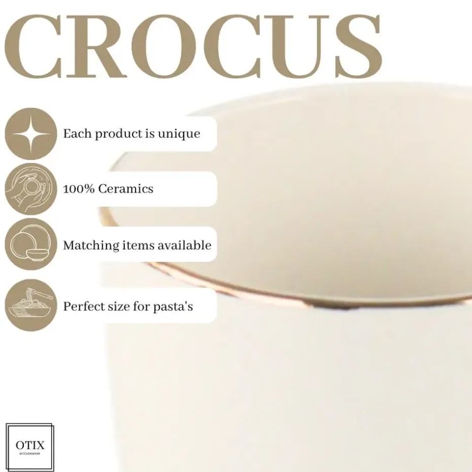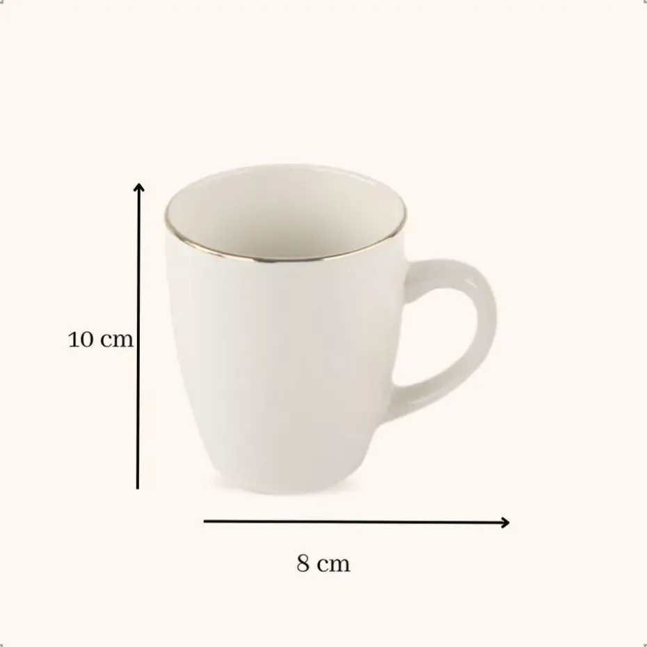 OTIX mokken set. De set van wit met gouden mokken is een set van 6 stuks. Het materiaal van de mokken is porselein, wat de mokken vaatwasser bestendig maakt. De mokken zijn wit en hebben een gouden rand aan de bovenkant.