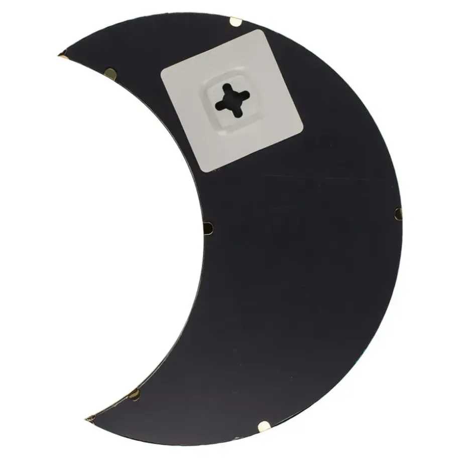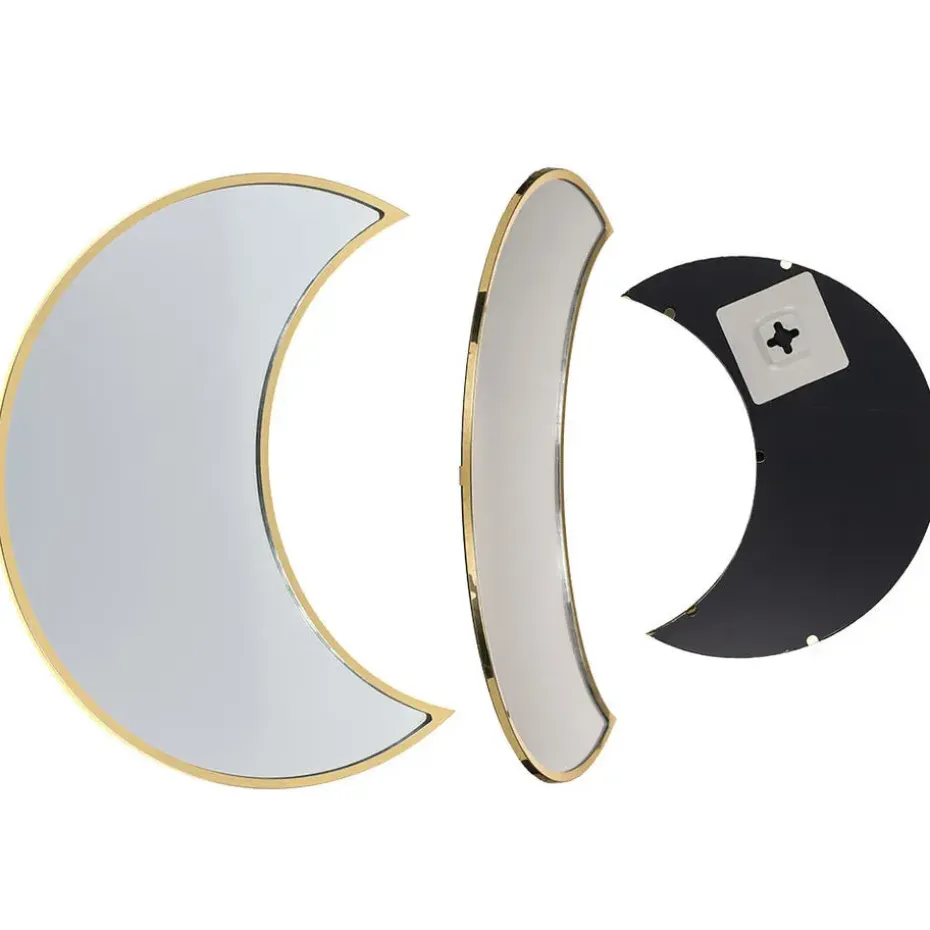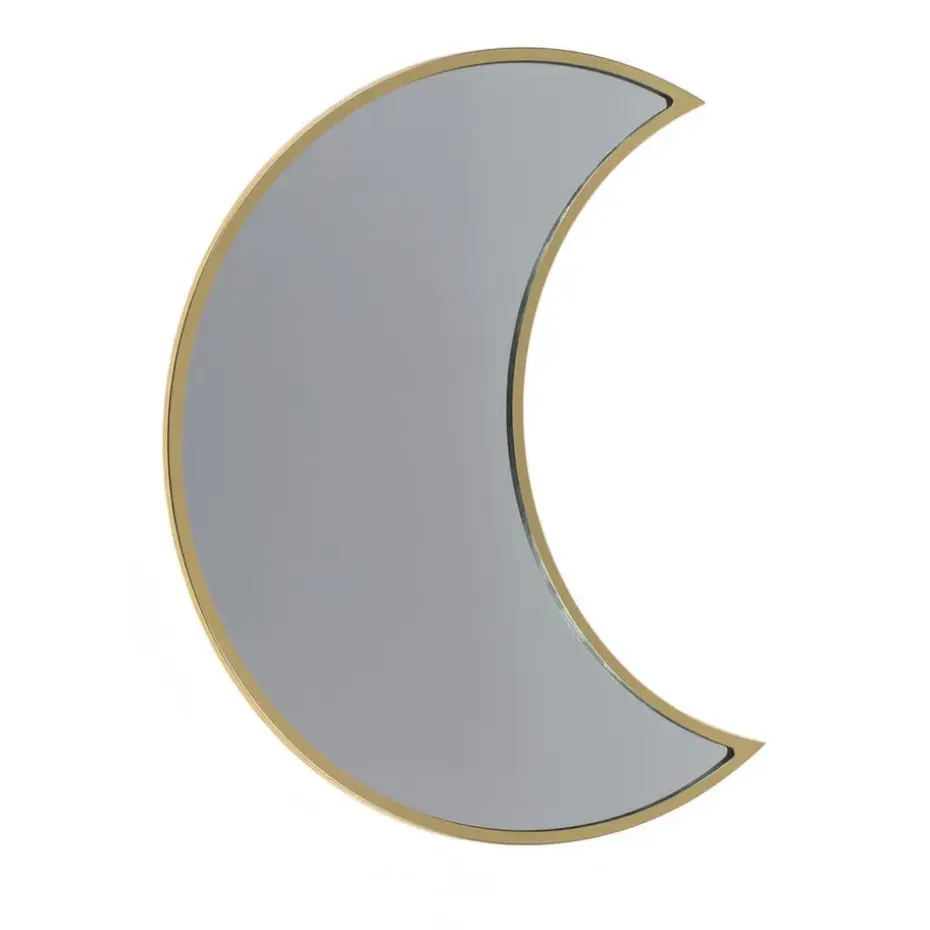 Wandspiegel in de vorm van een halve maan of een sikkel voor in de badkamer, gang of toilet spiegel met smalle metalen frame. Randkleur is goud. Deze spiegel is naast functioneel, ook een mooie vorm van decoratie voor aan de wand/muur. Het formaat van deze wandspiegel is ca. 25 x 11 x 6 cm. Merk: Out of the blue. Eenvoudig op te hangen met haakje aan de achterzijde.