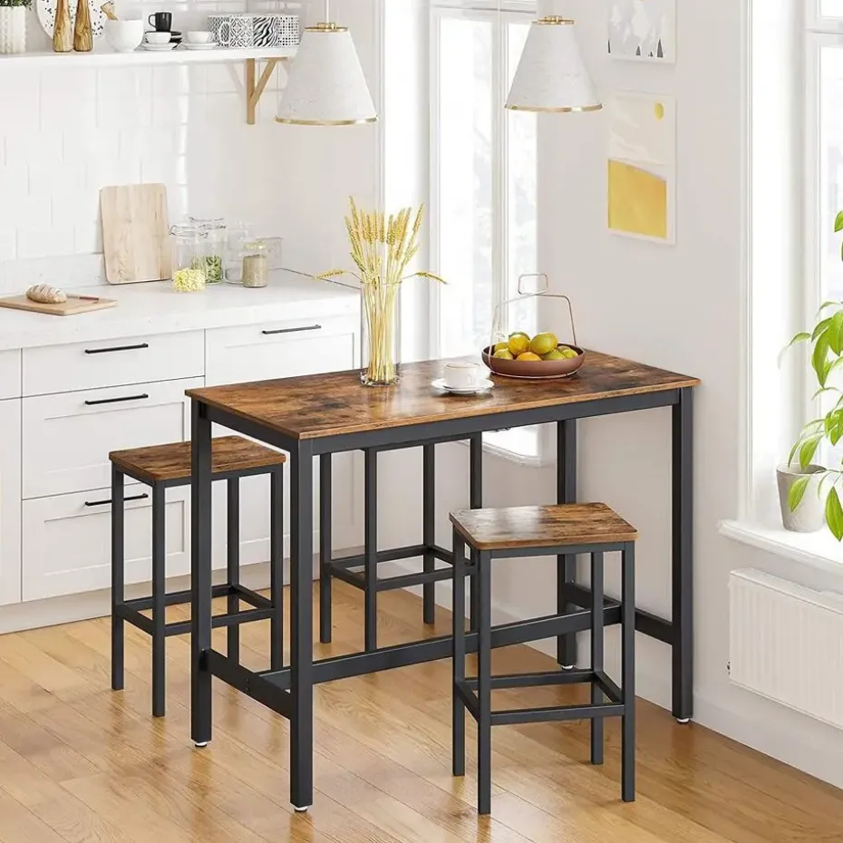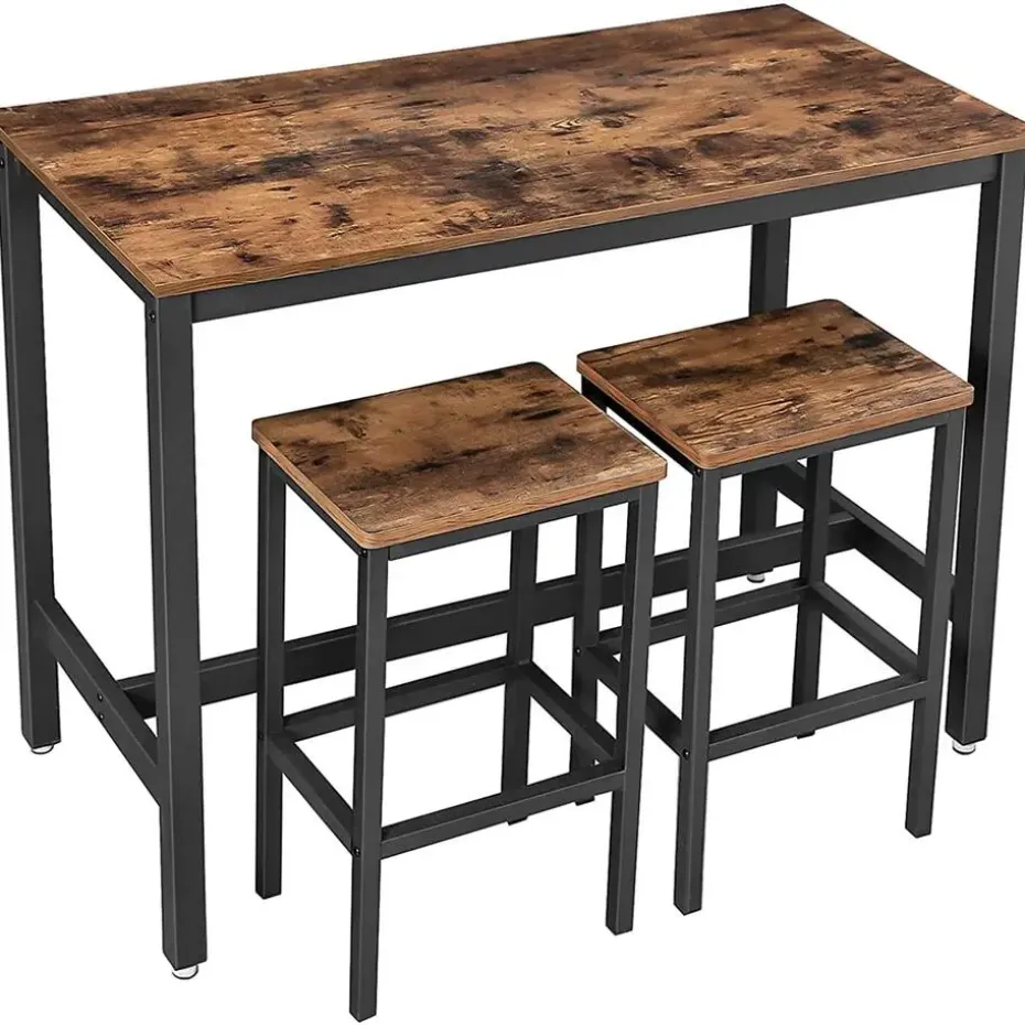 Deze rechthoekige bartafel inclusief 2 barstoelen past dankzij hun slanke en eenvoudige vorm perfect bij iedere huistijl. Het formaat van deze tafel is 100x40x90cm. De afmeting maakt het daarbij een perfect tafeltje voor in de keuken (als ontbijtbar) of in de woonkamer. Het rustieke blad met de zwarte metalen poten zorgt voor de industriele look van deze tafel. Daarnaast is de tafel eenvoudig te monteren. De 2 barstoelen zijn in de zelfde stijl als de tafel.