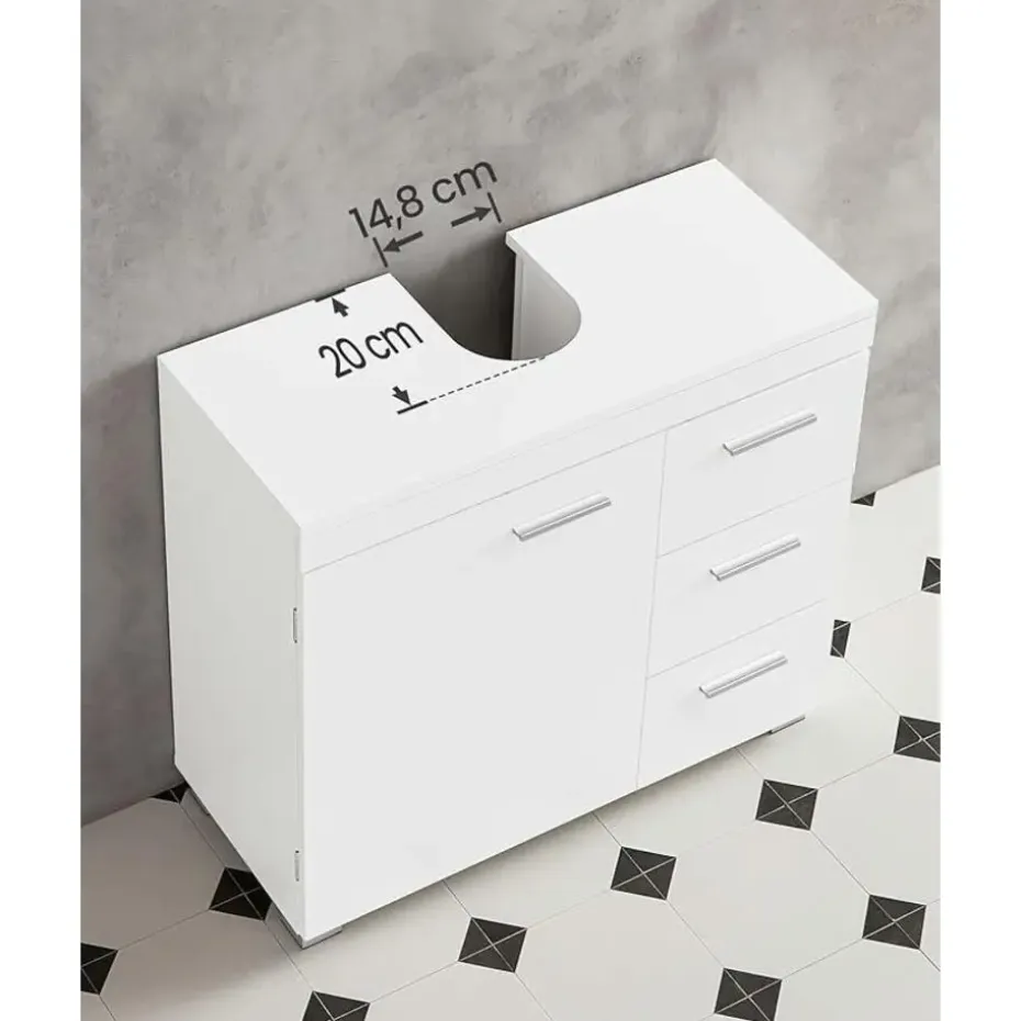 De afmetingen van de kast zijn 30 x 70 x 64 cm (D x B x H), terwijl de opening voor de sifon 20 x 15 cm meet. Zorg ervoor dat je de afmetingen van je sifon en gootsteen controleert om er zeker van te zijn dat deze badkamermeubel perfect in je ruimte past.