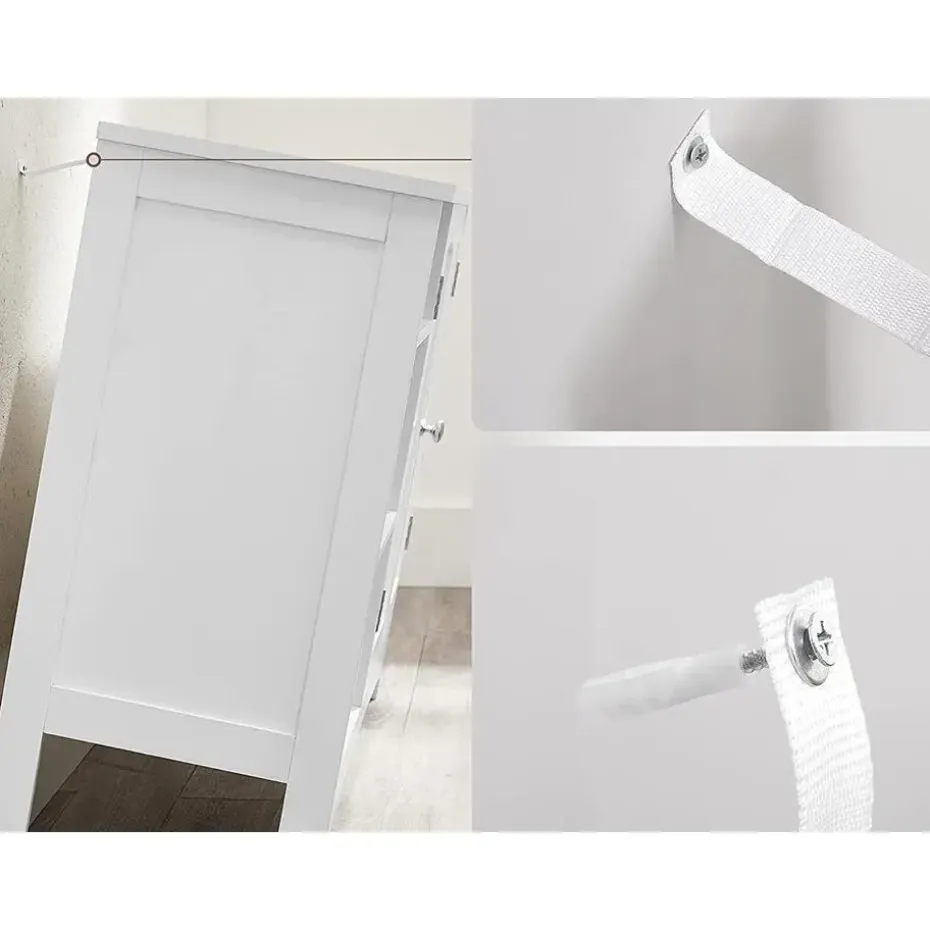 Aan de linkerkant is een open schap voorzien van twee verstelbare legplanken. Vaak gebruikte voorwerpen zoals kammen en parfums kunnen in deze open vakken worden opgeborgen. Hierdoor zijn deze voorwerpen direct bij de hand en kan je ze ook moeilijk kwijtraken.