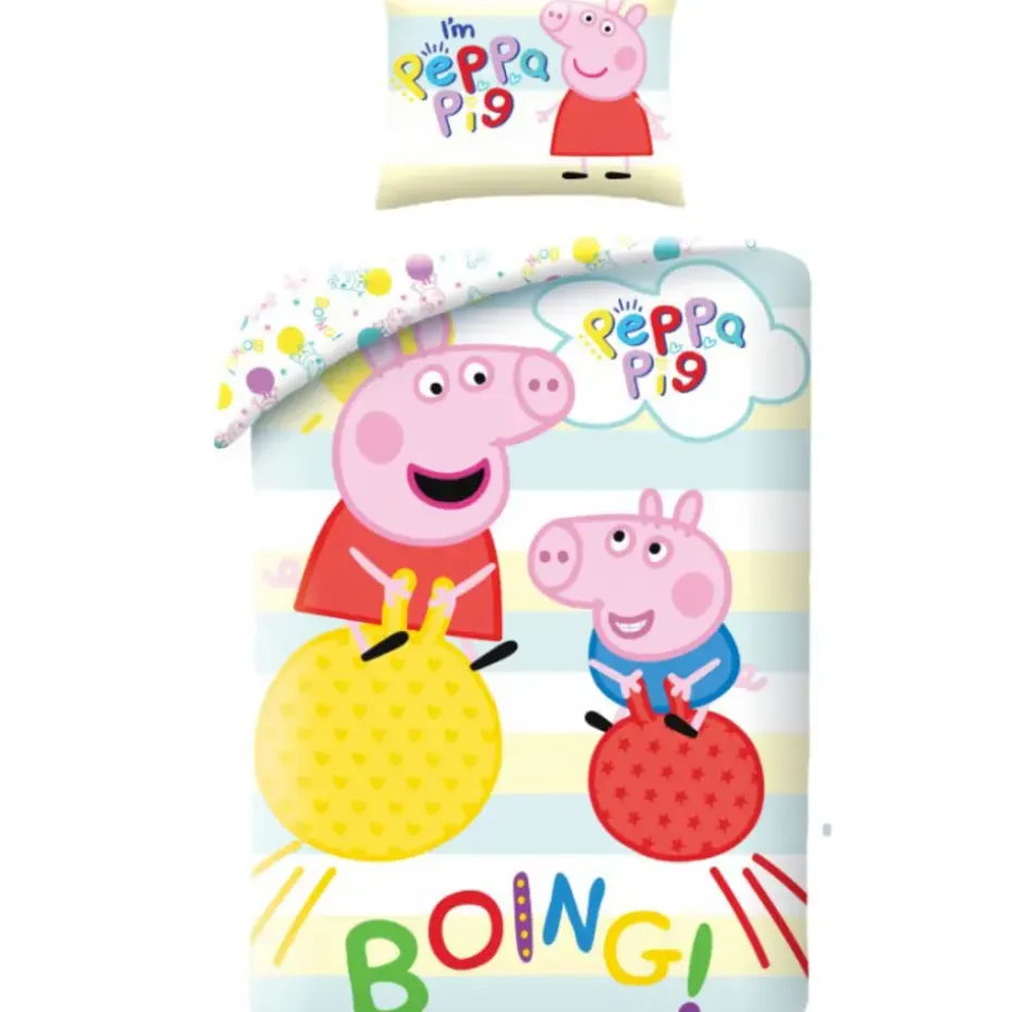 Peppa Pig Dekbedovertrek, Boing. Peppa en haar broertje George hebben de grootste lol met hun skippy-bal! Doe jij met ze mee? Dit vrolijke katoenen dekbedovertrek is een leuke aanwinst voor de kinderkamer. De leuke kleuren, de dubbelzijdige functie van het overtrek en de extra grote kussensloop zorgen ervoor dat er gespeeld kan worden met de opmaak van het bed. Kortom; een echte blikvanger en een geweldig cadeau idee voor een verjaardag of de feestdagen. Wordt geleverd in een leuk bijpassend katoenen tasje.
