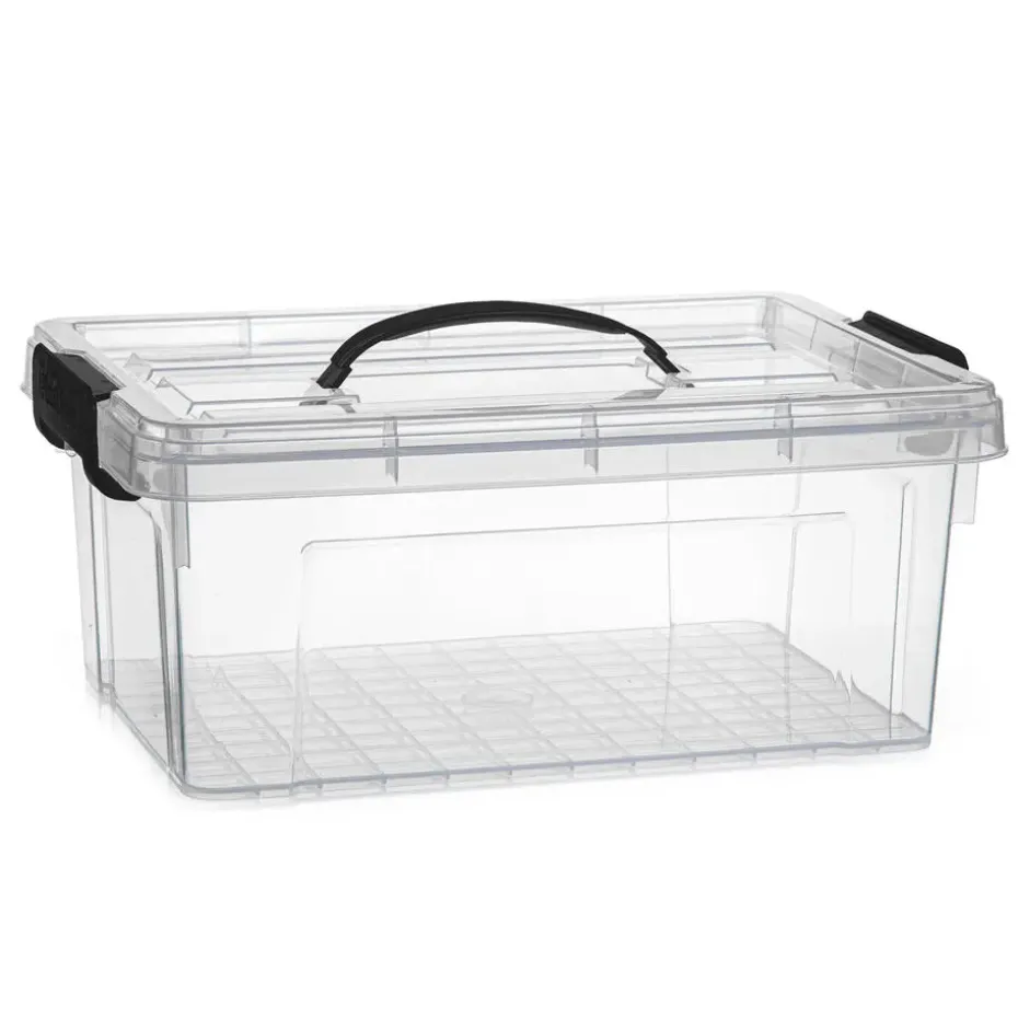 Opslagbox/kist met zijklem deksel met inhoud van 8.5 liter. De opslagbox / opbergbox is in de kleur transparant grijs en is gemaakt van stevig kunststof. Met handige oppak hengsel aan de bovenzijde. Afmetingen: 36 x 26 x 15 cm. Handige spullen / kleding / speelgoed / gereedschap opslag bewaar box/doos. Stapelbaar bij meerdere stuks. Merk: Plasticforte.