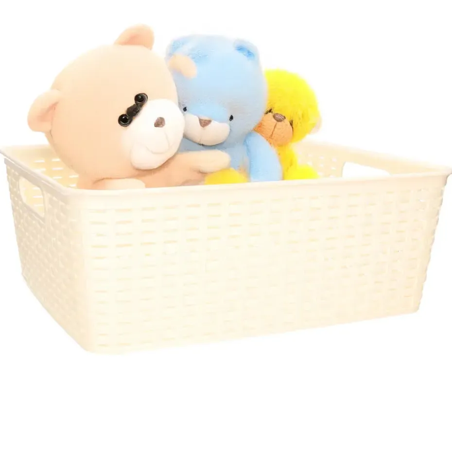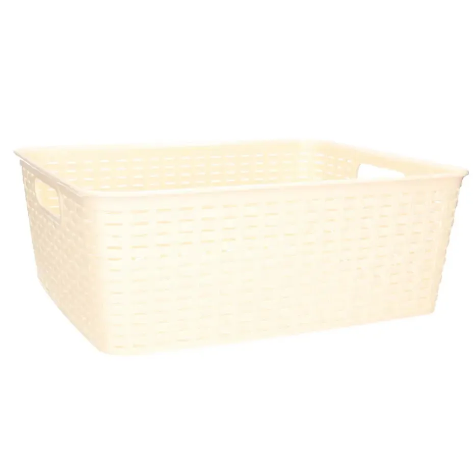 Opbergmand/kastmand gemaakt van rotan gevlochten kunststof in de kleur zacht geel. Deze manden zijn kast-organisers of zijn prima in de woonkamer, badkamer, keuken of slaapkamer plaatsen. De mandjes zijn bijvoorbeeld geschikt voor het opbergen van speelgoed, kleding stukken, kantoor spullen, etenswaren en het opbergen van diverse spullen. Formaat: ongeveer 30 x 37 x 13 cm. Inhoud: 12 liter.