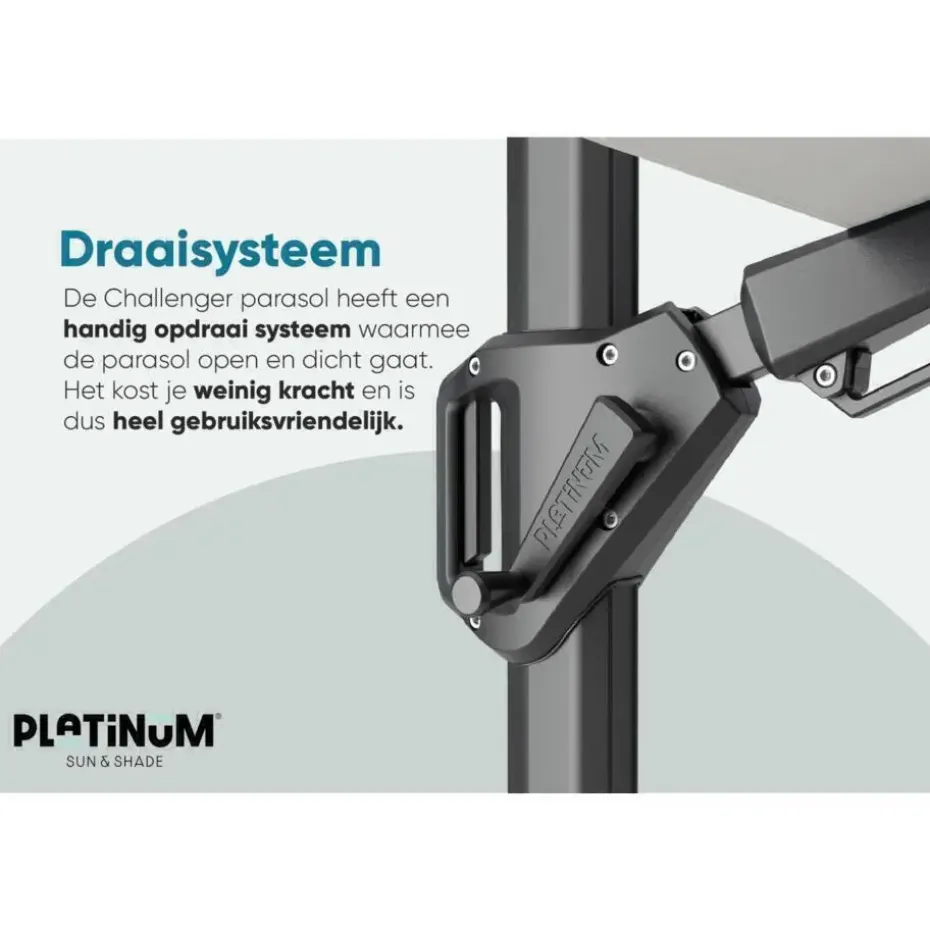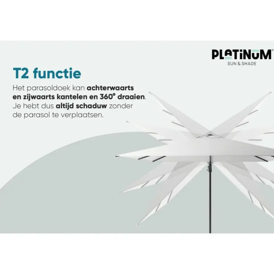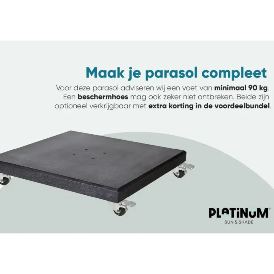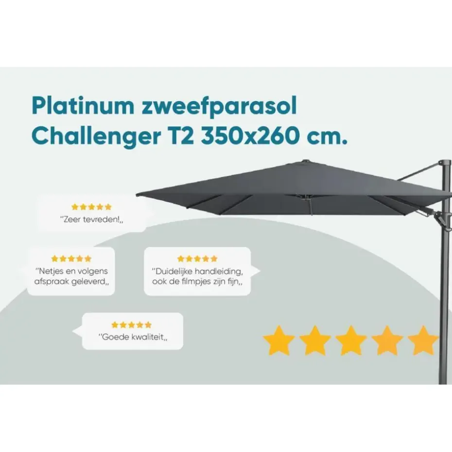 De Challenger T2 zweefparasol wordt standaard geleverd exclusief parasolvoet en parasolhoes. Wij raden u aan om gebruik te maken van een parasolvoet van minstens 90 kg. Deze hebben wij zowel met- als zonder wielen. Ook is het mogelijk om te kiezen voor een ingraafparasolvoet. Deze heeft als voordeel dat je meer ruimte op je terras over hebt. Kortom genieten doe je in de schaduw met de Platinum Challenger T2 3,5×2,6m. zweefparasol.