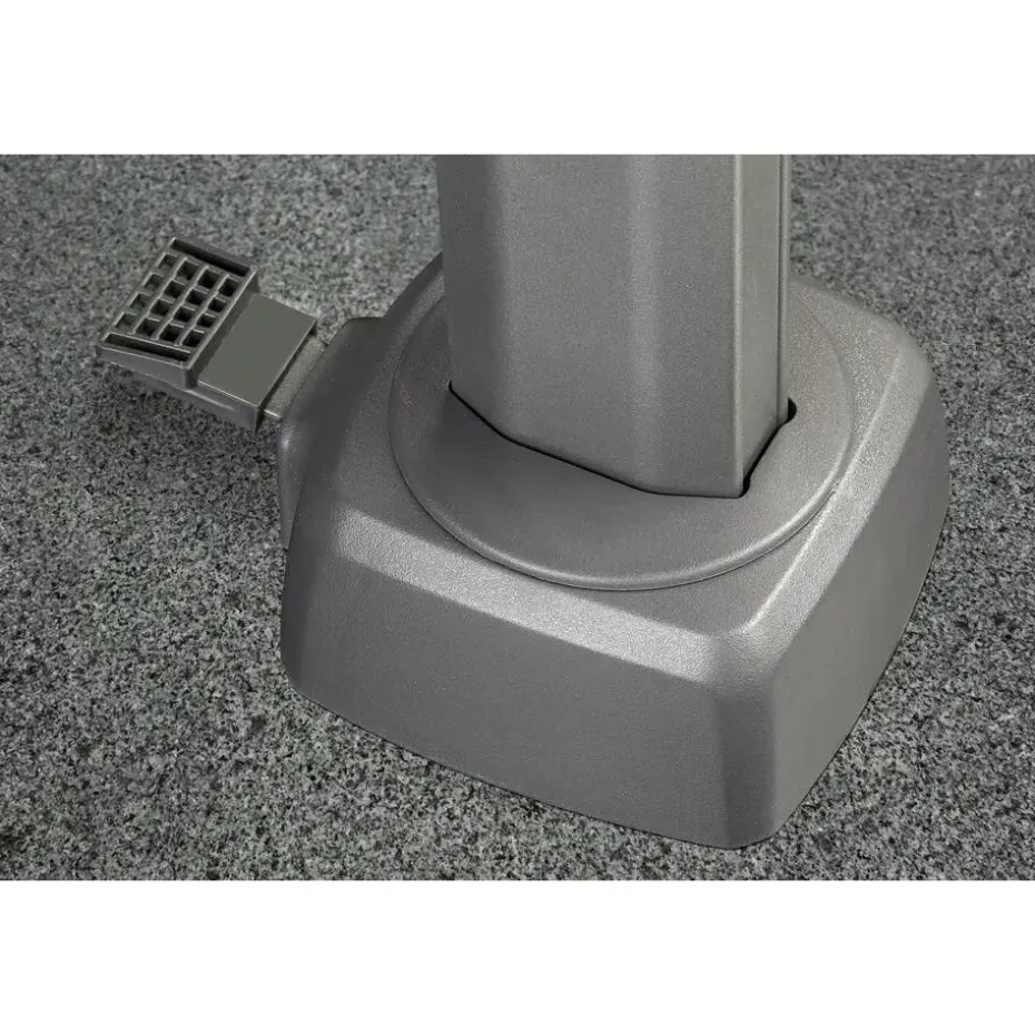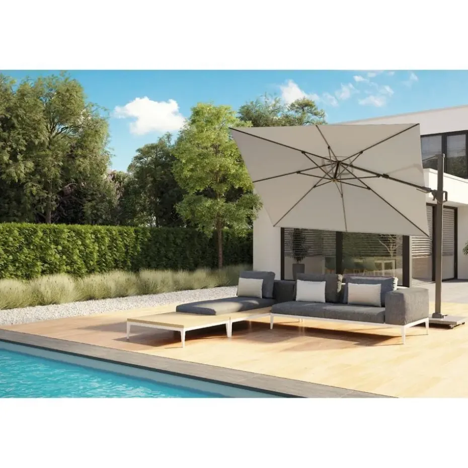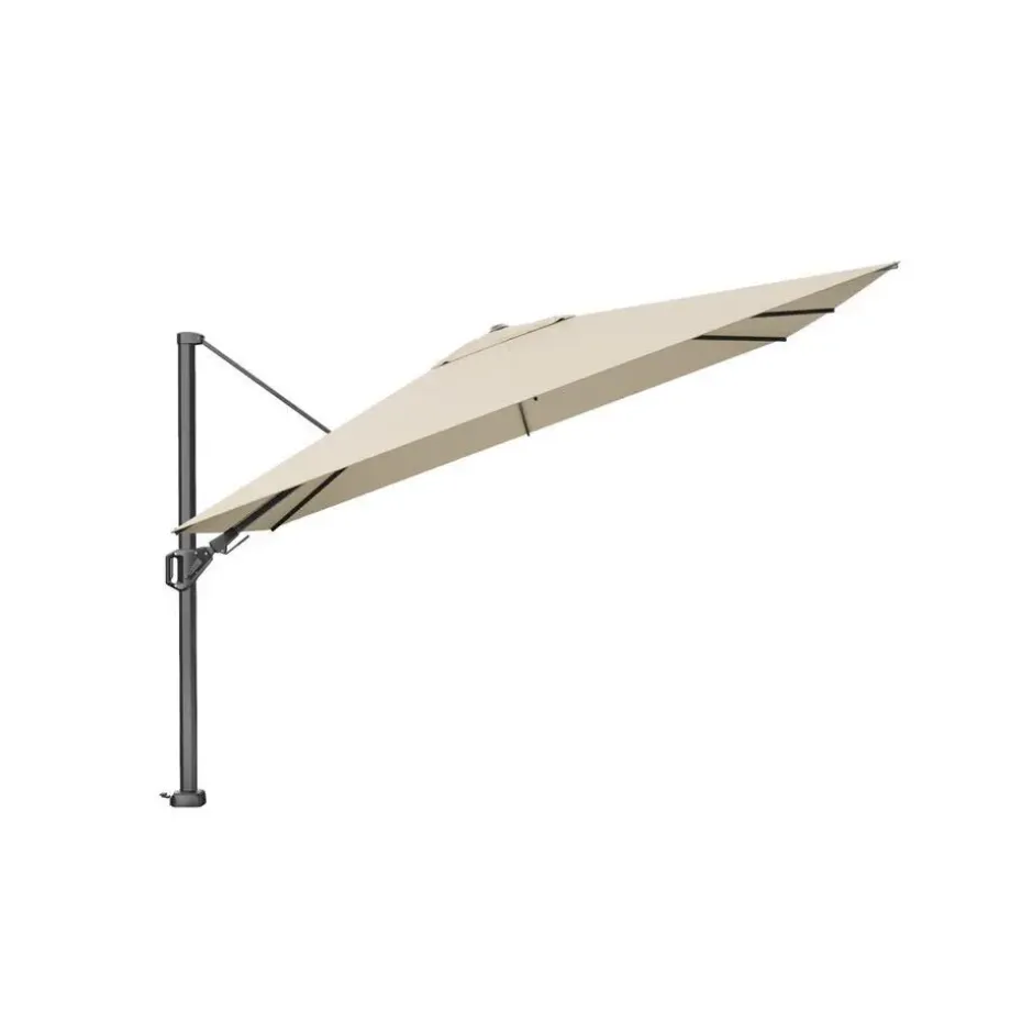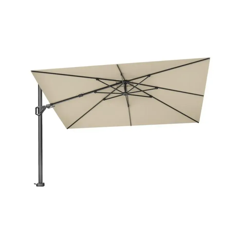 De Challenger T2 zweefparasol wordt standaard geleverd exclusief parasolvoet en parasolhoes. Wij raden u aan om gebruik te maken van een parasolvoet van minstens 90 kg. Deze hebben wij zowel met- als zonder wielen. Ook is het mogelijk om te kiezen voor een ingraafparasolvoet. Deze heeft als voordeel dat je meer ruimte op je terras over hebt. Kortom genieten doe je in de schaduw met de Platinum Challenger T2 3,5×2,6m. zweefparasol.