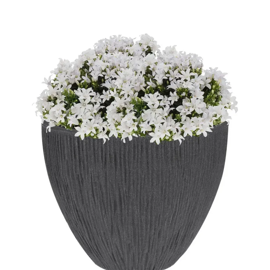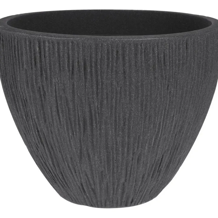 Plantenpot/bloempot gemaakt van kunststof(Polyethyleen) in de kleur antraciet grijs met relief lava strepen aan de buitenzijde. Deze prachtige bloempot uit de Pompei serie is een schitterende toevoeging aan uw tuin/terras. De pot is enkelwandig. Voor buiten gebruik. Ronde vorm.