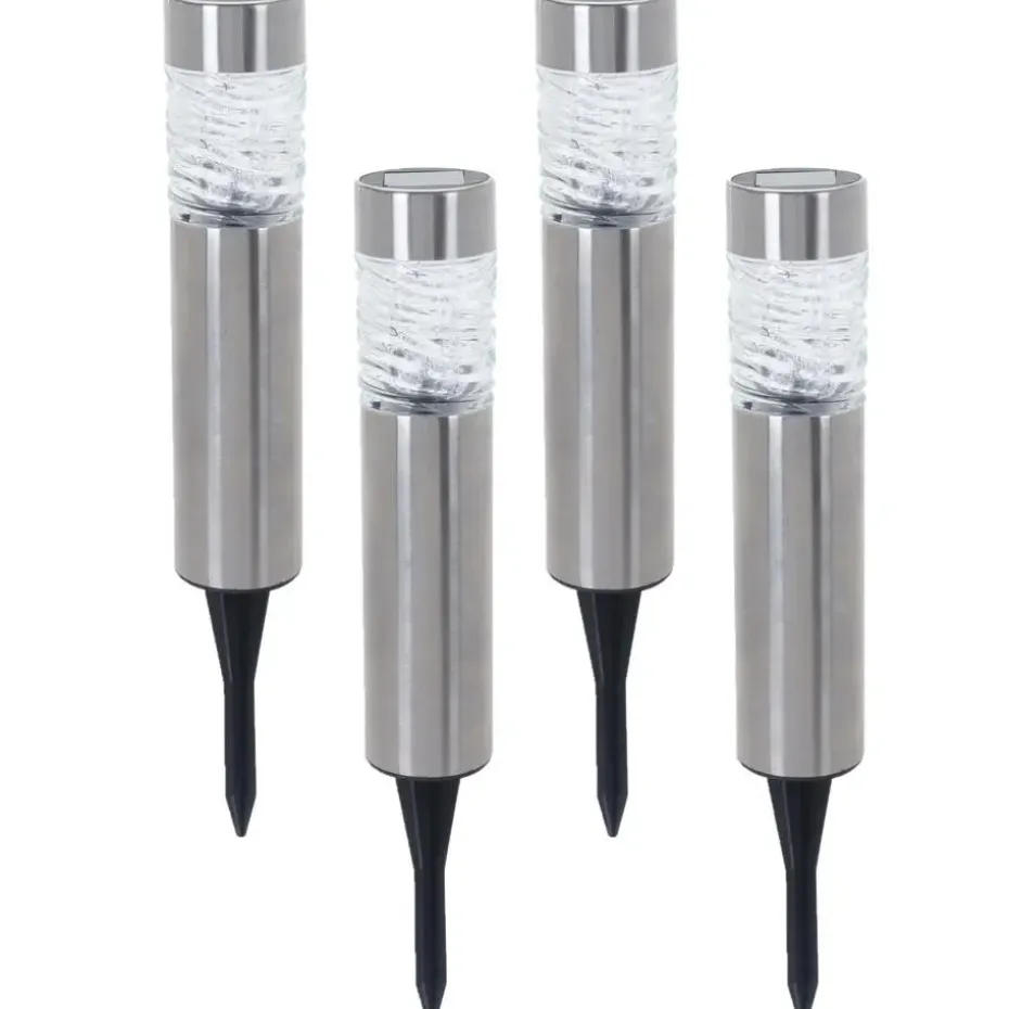 Set van 4x stuks solar tuinlampen, met LED verlichting voor de tuin. De lamp werkt op zonne-energie waardoor het zichzelf oplaadt gedurende de dag. Inclusief grondpin, zodat u ze bijvoorbeeld langs een looppad kunt zetten. Schakelaar: ja. Kleur licht: koud wit. Kleur lamp: zilver. Afmeting: 39 x 6 x 6 cm. Materiaal: RVS met glas. Inclusief batterijen. Tuinlampen/tuinverlichting/prikspots op zonne-energie.