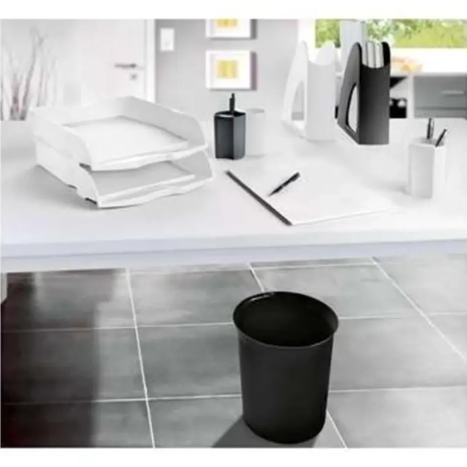 Een zwarte papierbak/vuilnisbak/prullenbak, met een inhoud van 13 liter. Doorsnede boven/onder: 288/226 mm. Hoogte: 287 mm. Materiaal: kunststof. Kantoorartikelen/kantooraccessoires.