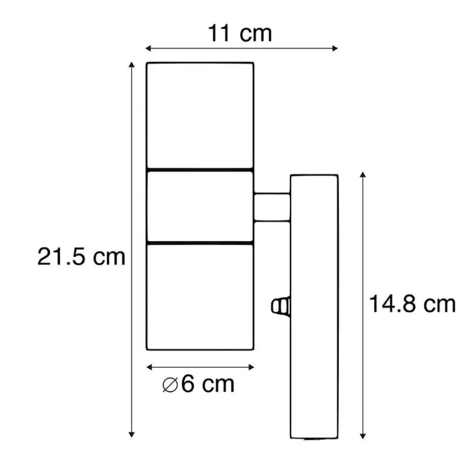 De lamp heeft een diepte van 11 cm en een hoogte van 21,5 cm. De montageplaat heeft een lengte van 14,8 cm en een breedte van 6,8 cm.