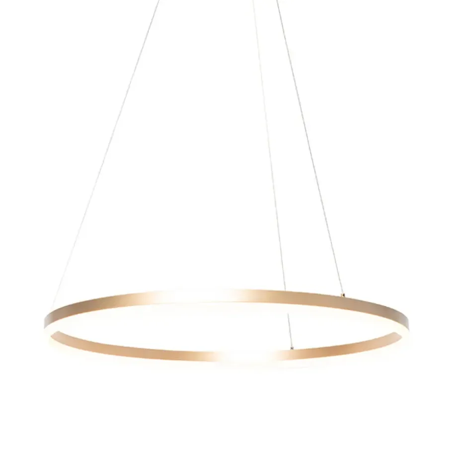 Een strakke en moderne hanglamp is deze Anello. De bovenkant van de ring is goud en de onderkant bestaat uit een ingebouwde LED ring. De LED ring heeft 53 Watt, 2.700 Kelvin en geeft 6777 lumen. Deze hanglamp heeft een heel speciaal ingebouwd dimsysteem. De lamp is drie staps dimbaar. Dat wil zeggen dat je zelf je dimstand kan kiezen. Op stand 1 schijnt de lamp voor 100%, op stand 2 voor 60% en stand 3 is enorm gezellig licht: dan schijnt de lamp nog maar voor 30%. Wanneer je op de schakelaar drukt laat de lamp zijn range van standen automatisch zien. Door nogmaals op de schakelaar te drukken kies je een lichtstand uit, hiermee gaat ook de lamp uit. Druk je hierna nog een keer op de schakelaar heeft de lamp de door jou gekozen lichtstand. Deze ring heeft een diameter van 80 cm en is ook verkrijgbaar in 40 cm en 60 cm. Hij is verstelbaar in hoogte, minimaal 38 cm en maximaal 120 cm. Een modern pareltje voor jouw woning!