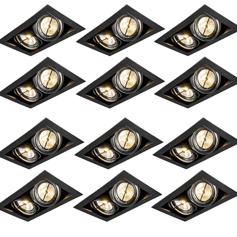 Met deze set van 12 2-lichts inbouwspots Oneon haal je een stijlvol en luxueus design in huis. Elke 2-lichts spot heeft een lengte van 34,3 cm en een breedte van 19,6 cm. De inbouw afmetingen: diepte 11 cm, lengte 31 cm en breedte 16 cm. Deze inbouwspots zijn gemaakt van staal en afgewerkt in een zwarte kleur. De inbouwspots hebben een G53 fitting. De spot wordt afgemaakt met 24 AR111 LED-lampen (deze lichtbron heeft een diameter van 11 cm). Ook is hij dimbaar (dimmer niet bijgeleverd) en je kunt de lichtpunten los van elkaar verstellen. Simpel, maar stijlvol in jouw plafond: deze Oneon!