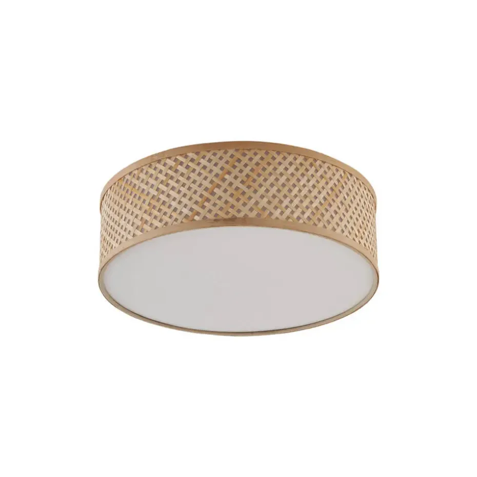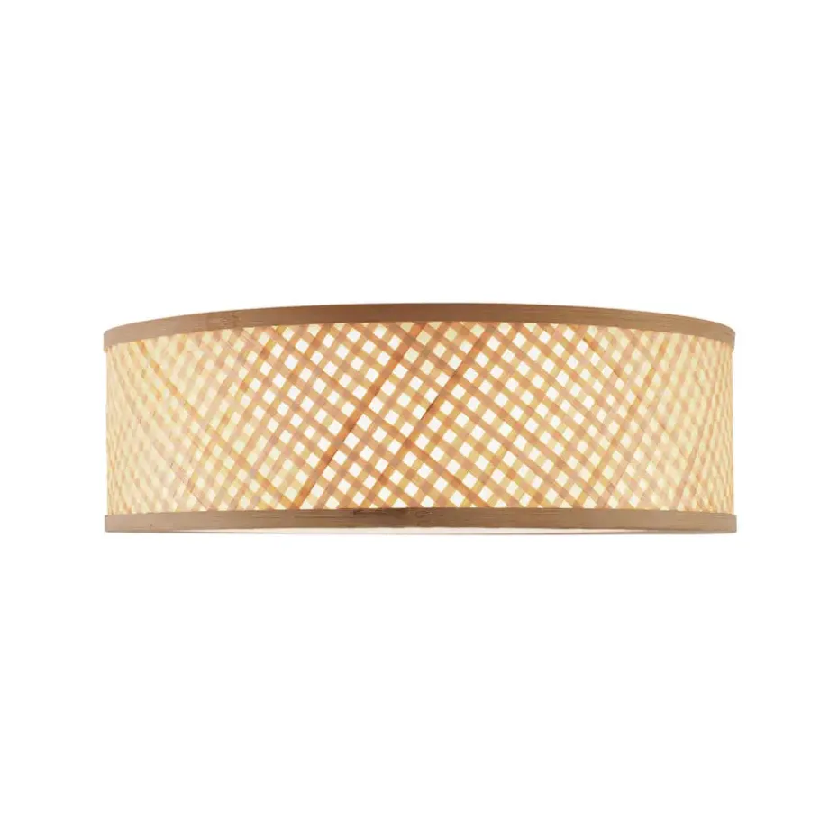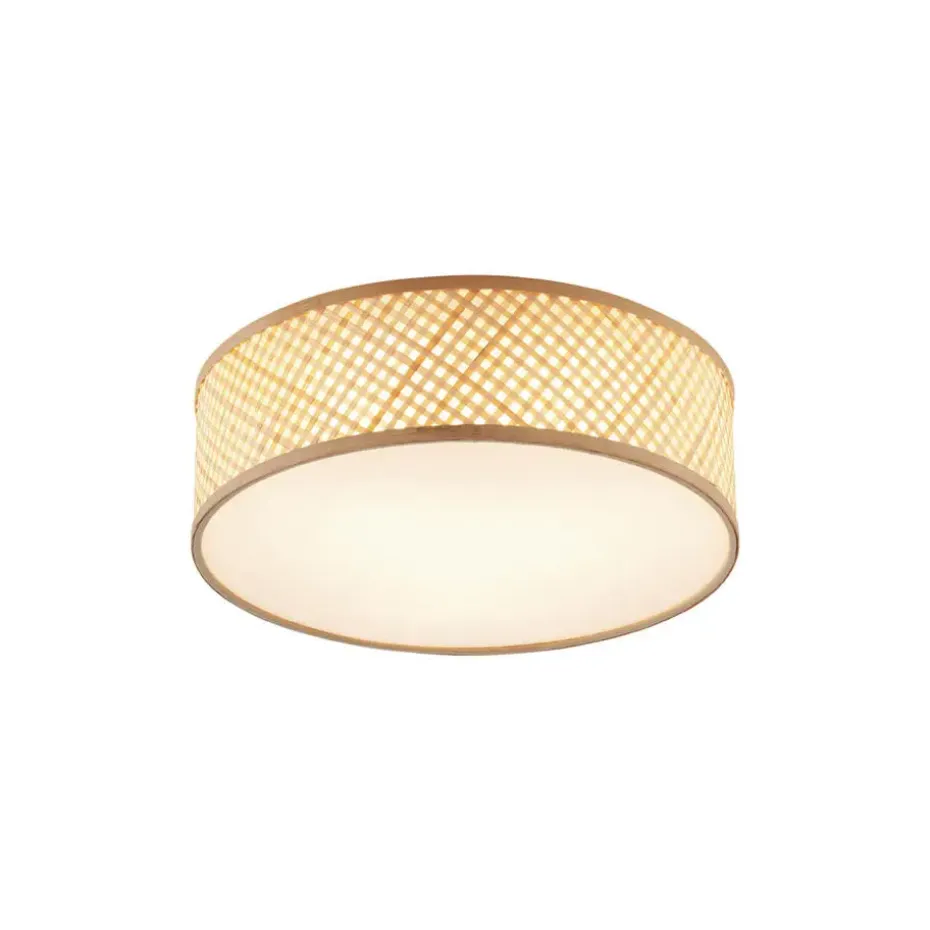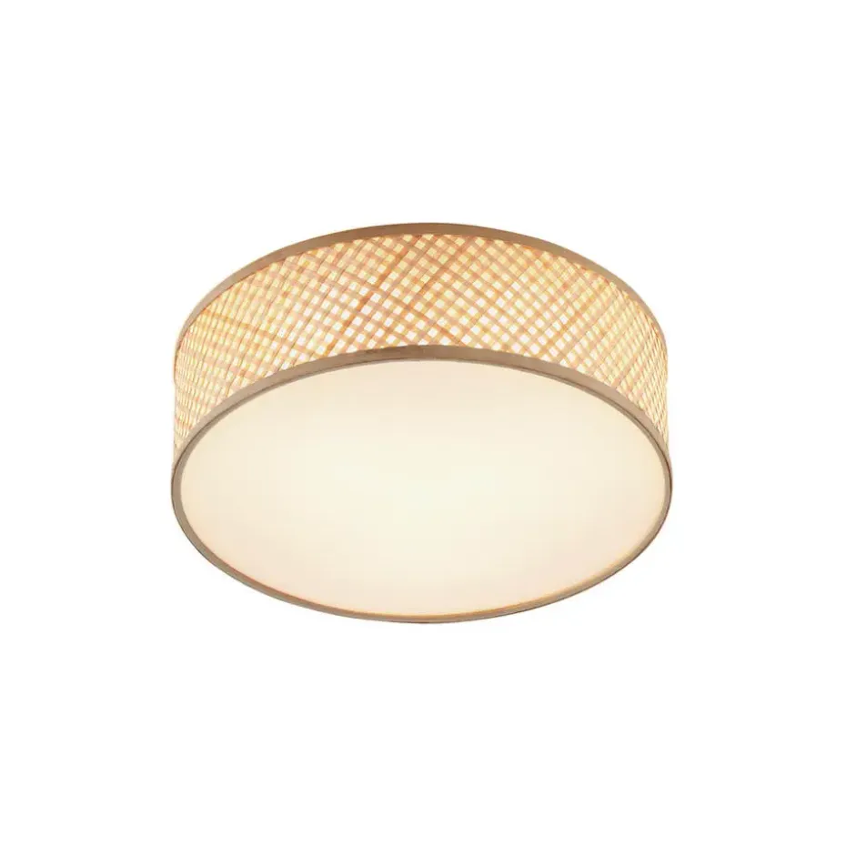 Haal natuurlijke warmte en een stijlvolle oosterse sfeer in huis met de Tremmo plafondlamp! Met zijn royale diameter van 40 cm en een prachtig gevlochten bamboe design in naturel tint, is deze lamp een echte blikvanger. Het opengewerkte patroon creëert een sfeervol lichtspel, terwijl de diffuser aan de onderkant zorgt voor een zachte en gelijkmatige verlichting.