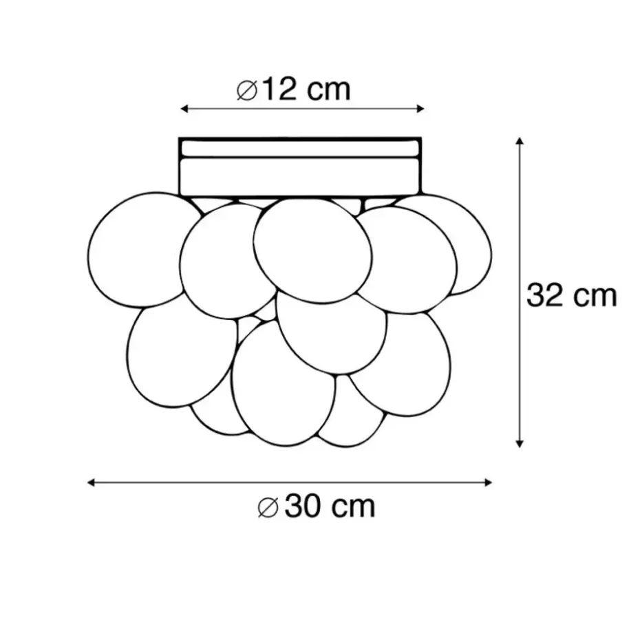 Hij heeft een diameter van 30 cm en een hoogte van 32 cm. Het montageplaatje heeft een diameter van 8 cm en een hoogte van 10 cm. Je maakt deze Uvas compleet met 3 G9 lichtbronnen (max. 28 Watt), deze moet je nog apart bijbestellen. Je kunt hem tevens dimmen met een externe dimmer; zo maak je het extra sfeervol in huis met de Uvas!